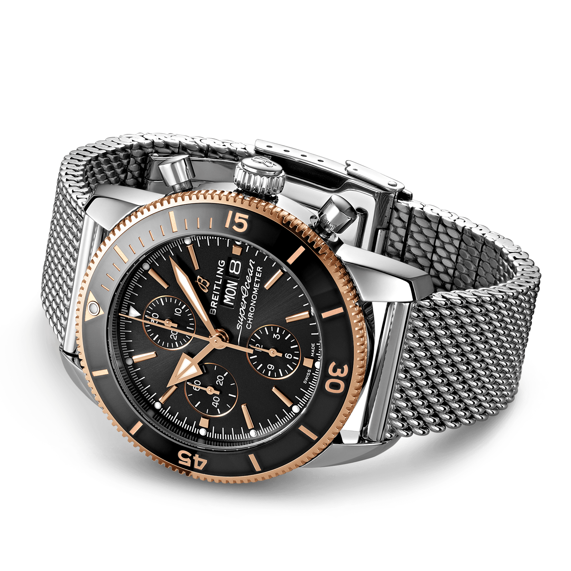 Breitling Superocean Heritage Chronograph 44mm Two-Tone Black Dial Bracelet Watch U13313121B1A1. Stainless steel & 18ct red gold 44mm case and black ceramic bezel all on a steel ocean classic bracelet. This men's watch has a black dial with golden hands and hour markers, day-date display at the 3o'clock position. Sapphire crystal glass and water resistant up to 200m. Power reserve up to 48 hours. Automatic chronograph movement.