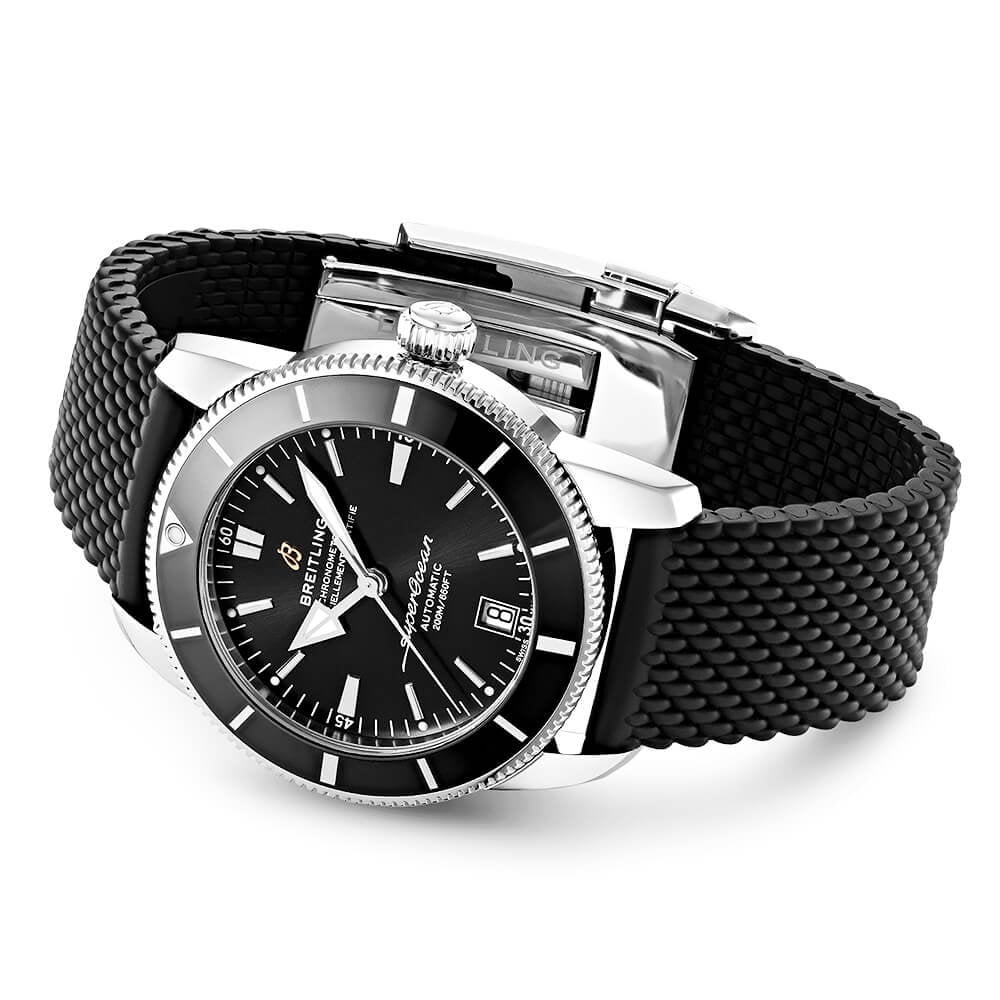 BreitlingSuperocean Heritage II 42mm Black Dial & Bezel Men's WatchAB2010121B1A1. Stainless steel 42mm case and black ceramic bezel all on a black rubber strap. This men's watch has a black dial with polished hands and indexes as well as a date display at the 6 o'clock position. Water resistant up to 200m and sapphire crystal glass. Automatic movement.