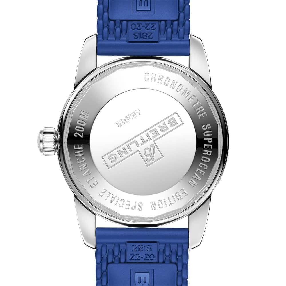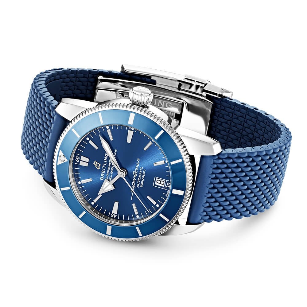 BreitlingSuperocean Heritage II 42mm Blue Dial & Bezel Rubber Strap WatchAB2010161C1S1. Stainless steel 42mm case and blue ceramic bezel all on a blue rubber strap. This men's watch has a sunray blue dial with polished hands and indexes as well as a date display at the 6 o'clock position. Water resistant up to 200m and sapphire crystal glass. Automatic movement.