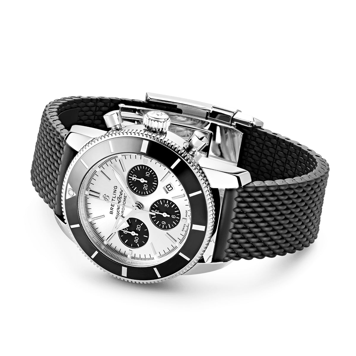 Breitling Superocean Heritage II 44mm Silver/Black Dial Rubber Strap Watch AB0162121G1S1. Stainless steel 44mm case and black ceramic bezel all on a black rubber strap with pushbutton folding clasp. This men's watch has a silver sunray dial with polished hands and hour markers as well as a day/date display at the 3 o'clock position. Water resistant up to 200m and sapphire crystal glass. Power reserve up to 48 hours. Automatic chronograph movement.