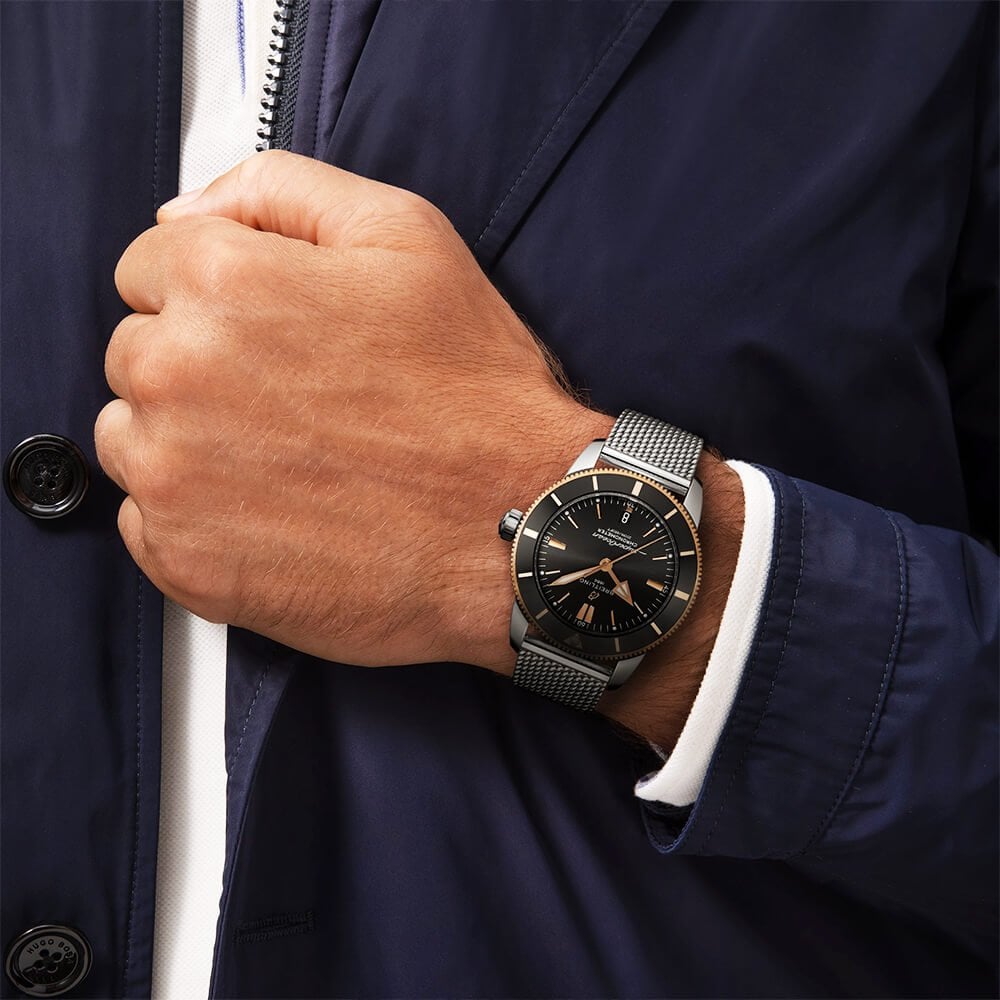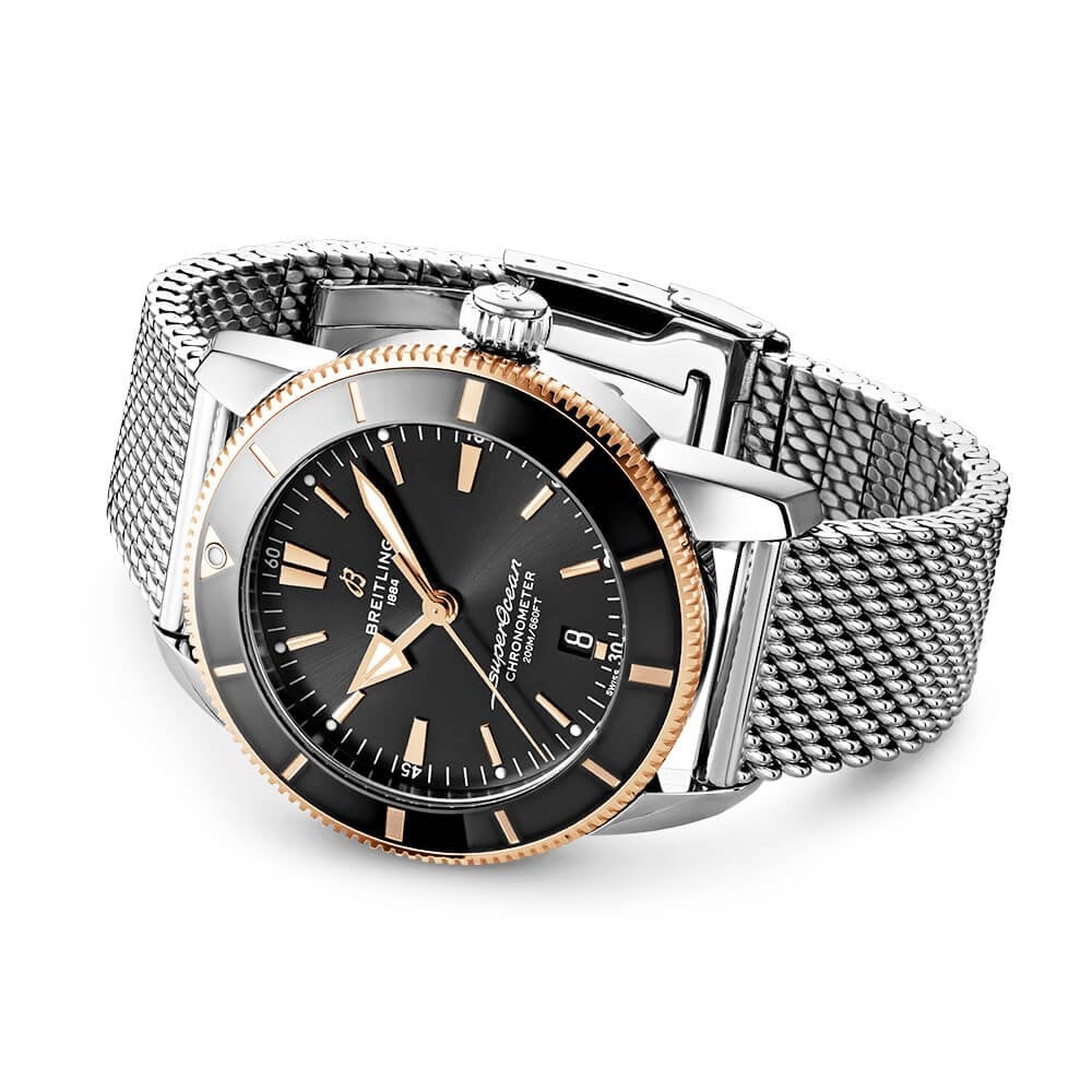 BreitlingSuperocean Heritage II 44mm Steel & 18ct Red Gold Bracelet WatchUB2030121B1A1. Stainless steel 44mm case and unidirectional black ceramic & 18ct red gold bezel all on a strap & buckle of your choosing. This stylish men's watch has a black index dial with gold applied hands and hour indexes as well as a date display at the 6 o'clock position. Cambered sapphire glass and water resistant up to 200m. Minimum 70 hours power reserve. Breitling 20 manufacture movement.