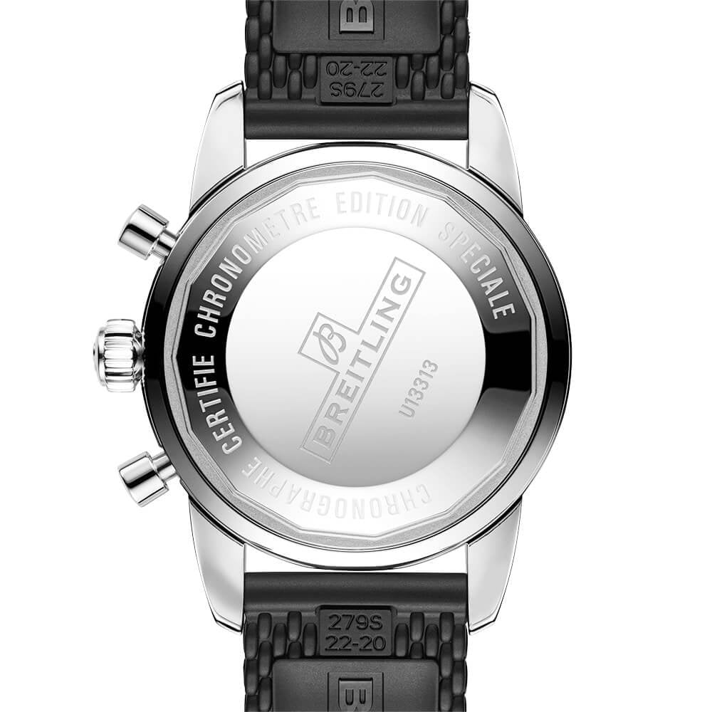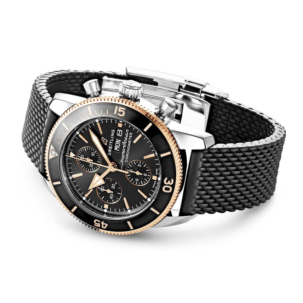 The Breitling Superocean Heritage Chronograph 44 watch is inspired by the much earlier Superocean watch from the 1950s. Its iconic design has now been blended with a modern touch for a sporty and elegant finish on the wrist. Embodying the iconic Superocean style, it Features a polished ceramic unidirectional rotating bezel with a 60-minute dive scale upon its surface and a striking stainless steel and 18ct rose gold case design. Presented on a black dial, the Breitling Superocean Heritage II 44mm watch Features gold hands treated with luminous material, a 1/4th of a second hand, a 30-minute counter at 12 o’clock and a 12-hour totaliser at 6 o’clock. The small seconds counter sits at 9 o’clock, balanced by a day and date feature at 3 o’clock. The front of this 200-meter water-resistant Breitling Superocean Heritage II 44 watch is topped with a cambered piece of sapphire crystal glass. Its screw-locked crown with two gaskets helps uphold its impressive water resistance, whilst a screwed-in caseback holds the Breitling 13 Calibre safe. It performs at a rate of 28,800 vibrations per hour and delivers a minimum power reserve of 48 hours once fully wound. To complete its desirable retro-inspired look, the Breitling Superocean Heritage II 44 watch is fitted on a black rubber strap with a stainless steel pushbutton folding clasp.