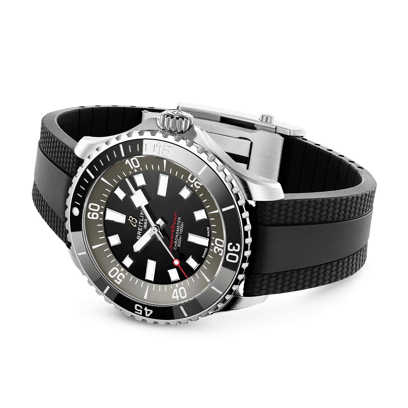Breitling Superocean 44mm UK Limited Edition Rubber Strap Watch A173765A1B1S1. Stainless steel 44mm case and black ceramic inlayed bezel all on a black rubber strap. This men's watch has a black, luminous applied hands and hour markers and red tipped seconds hand. Water resistant up to 300m and sapphire crystal glass. Automatic movement.
