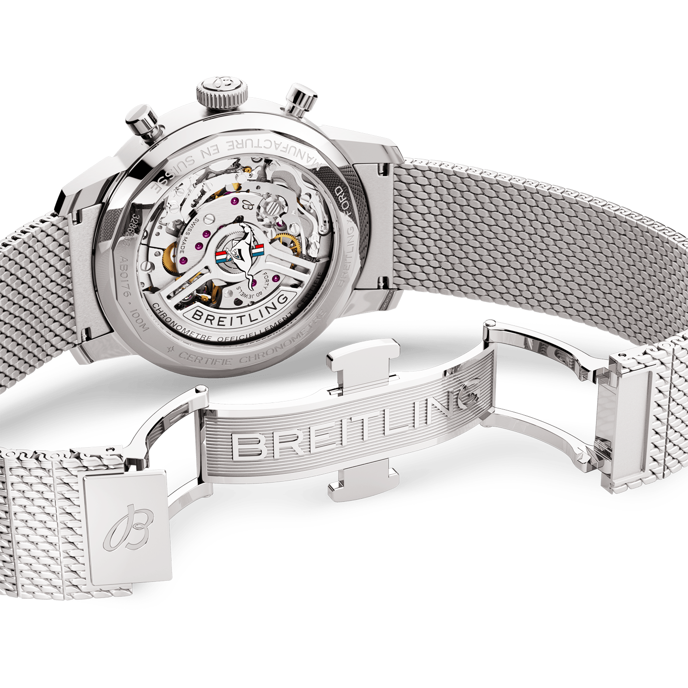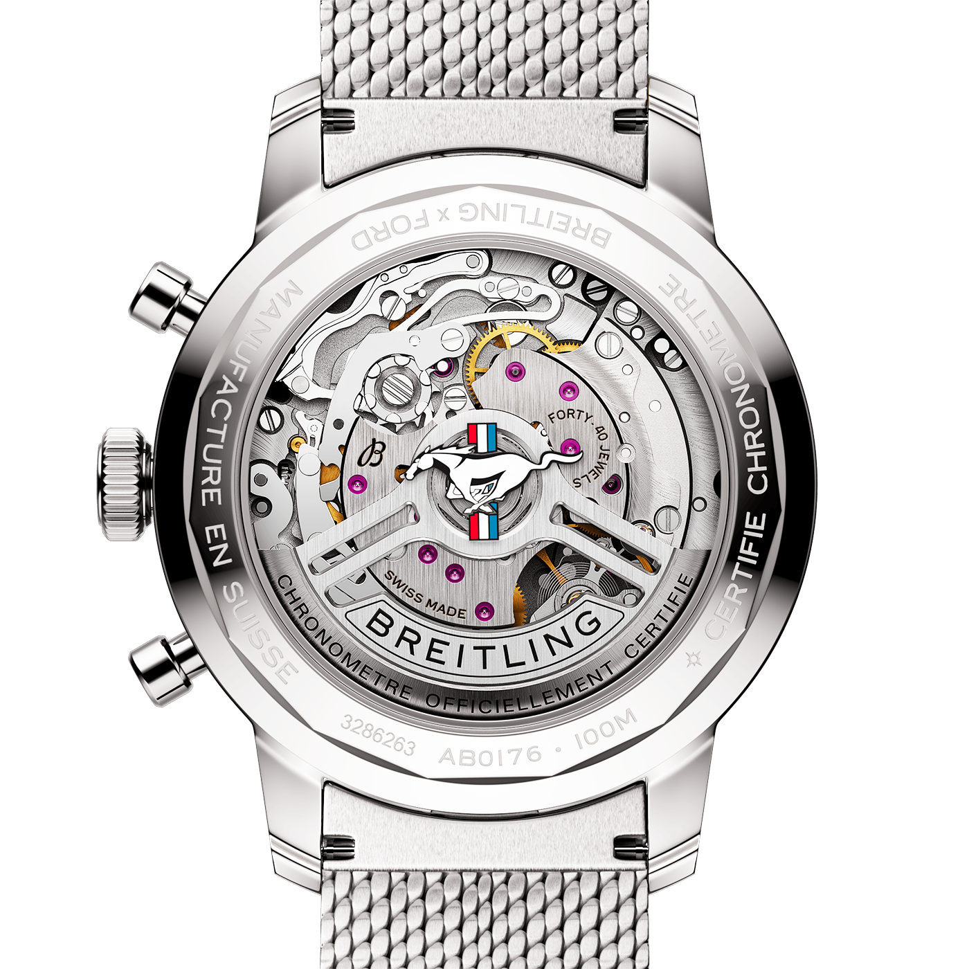 Breitling Top Time B01 Ford Mustang 41mm Green Dial Bracelet Watch AB01762A1L1A1. Stainless steel 41mm case and bezel all on a steel bracelet. This men's watch Features a green dial with contrasting black sub counters and outer dial, Ford Mustang logo at the 12 o'clock position. Exhibition caseback with Ford Mustang logo. Water resistant up to 100m and sapphire crystal glass. Power reserve up to 70 hours. Automatic chronograph movement.