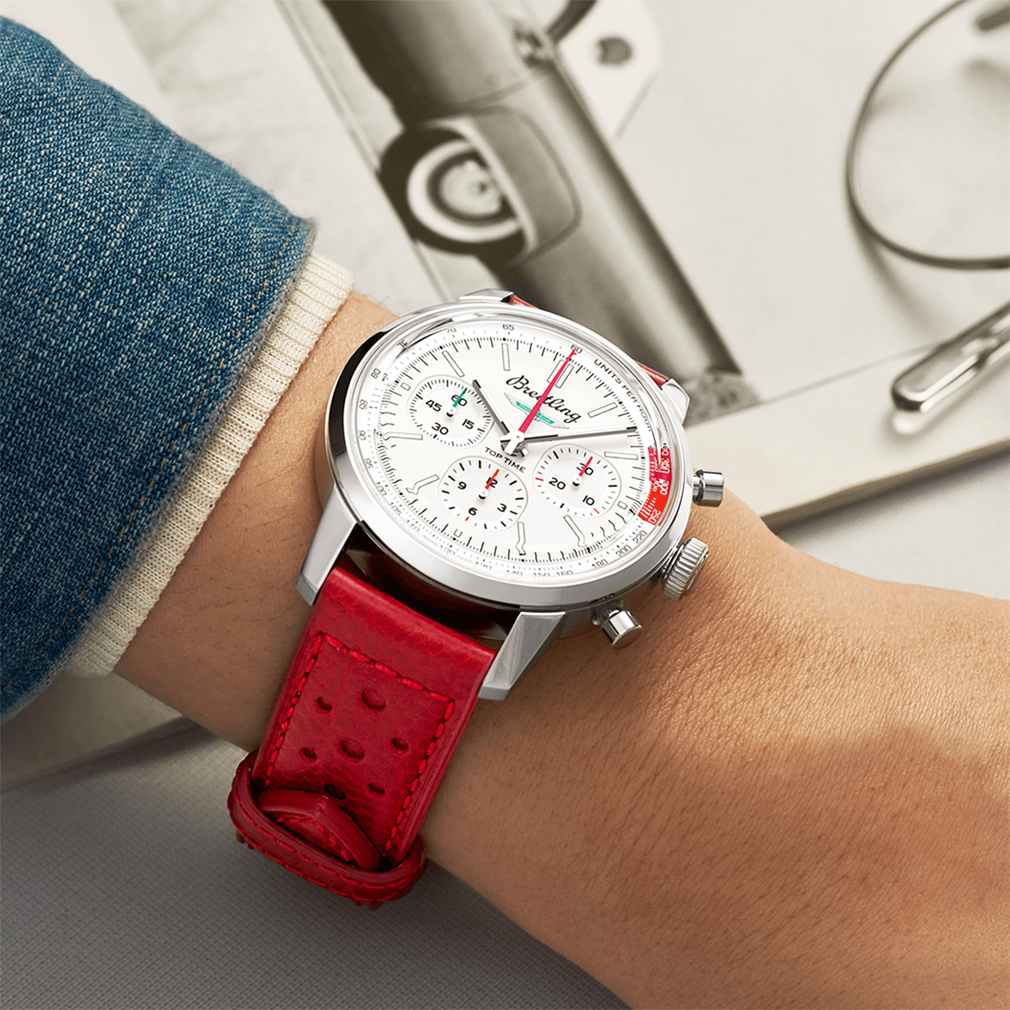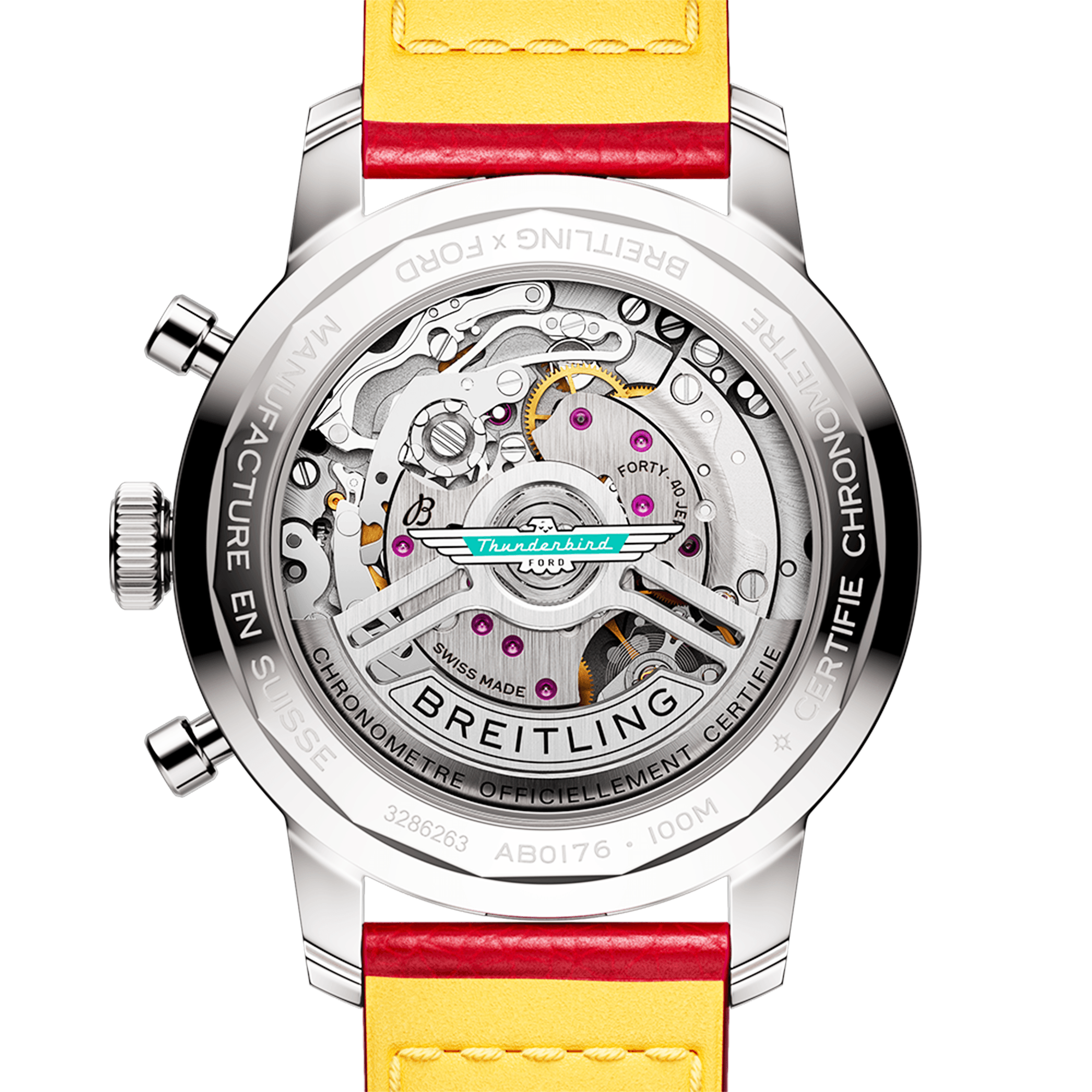 BreitlingTop Time B01 Ford Thunderbird 41mm White Dial Automatic Strap Watch AB01766A1A1X1. Stainless steel 41mm case and bezel all on a red leather strap. This men's watch Features a white dial with matching sub counters and outer dial, Ford Thunderbird logo at the 12 o'clock position. Exhibition caseback with Ford Thunderbirdlogo. Water resistant up to 100m and sapphire crystal glass. Power reserve up to 70 hours. Automatic chronograph movement.