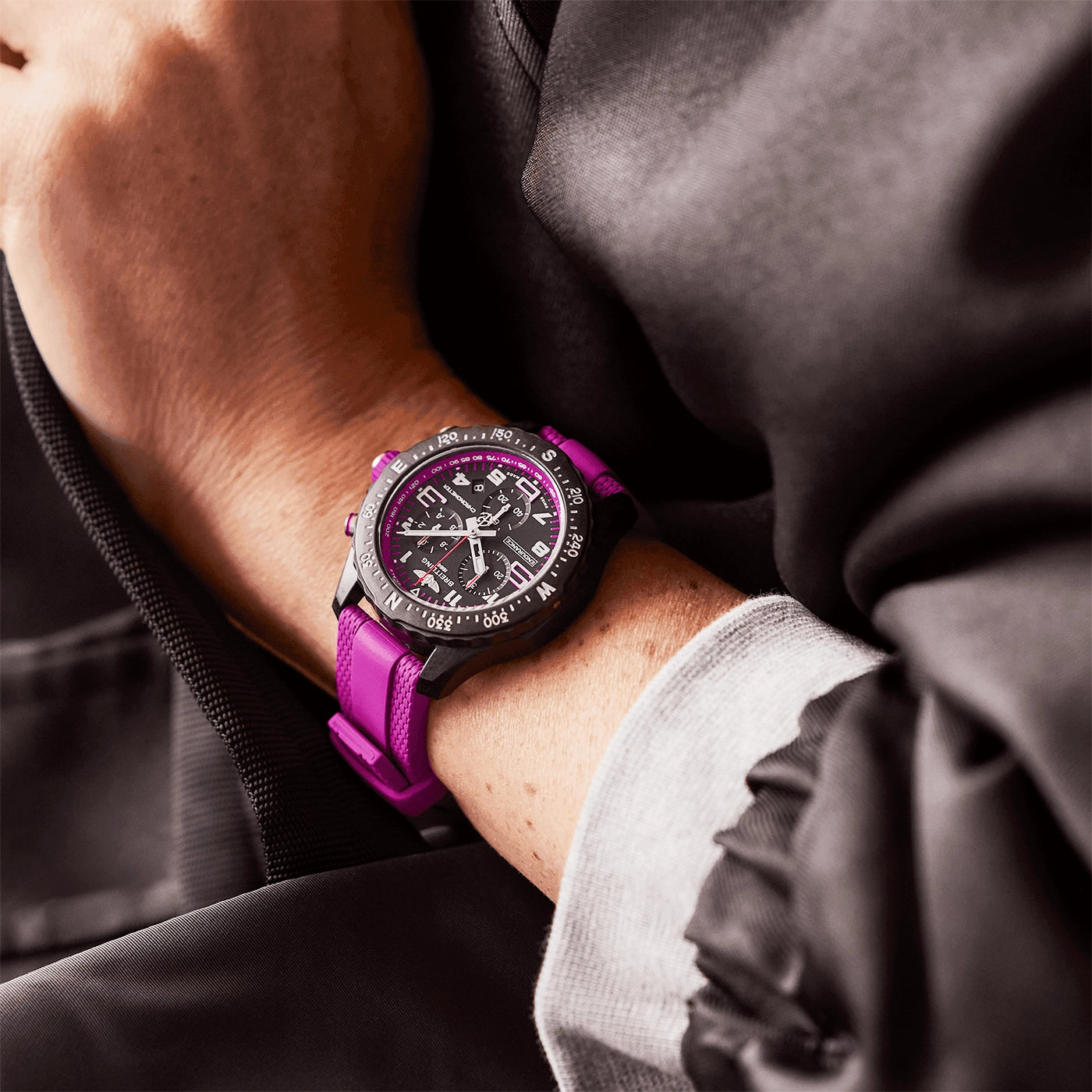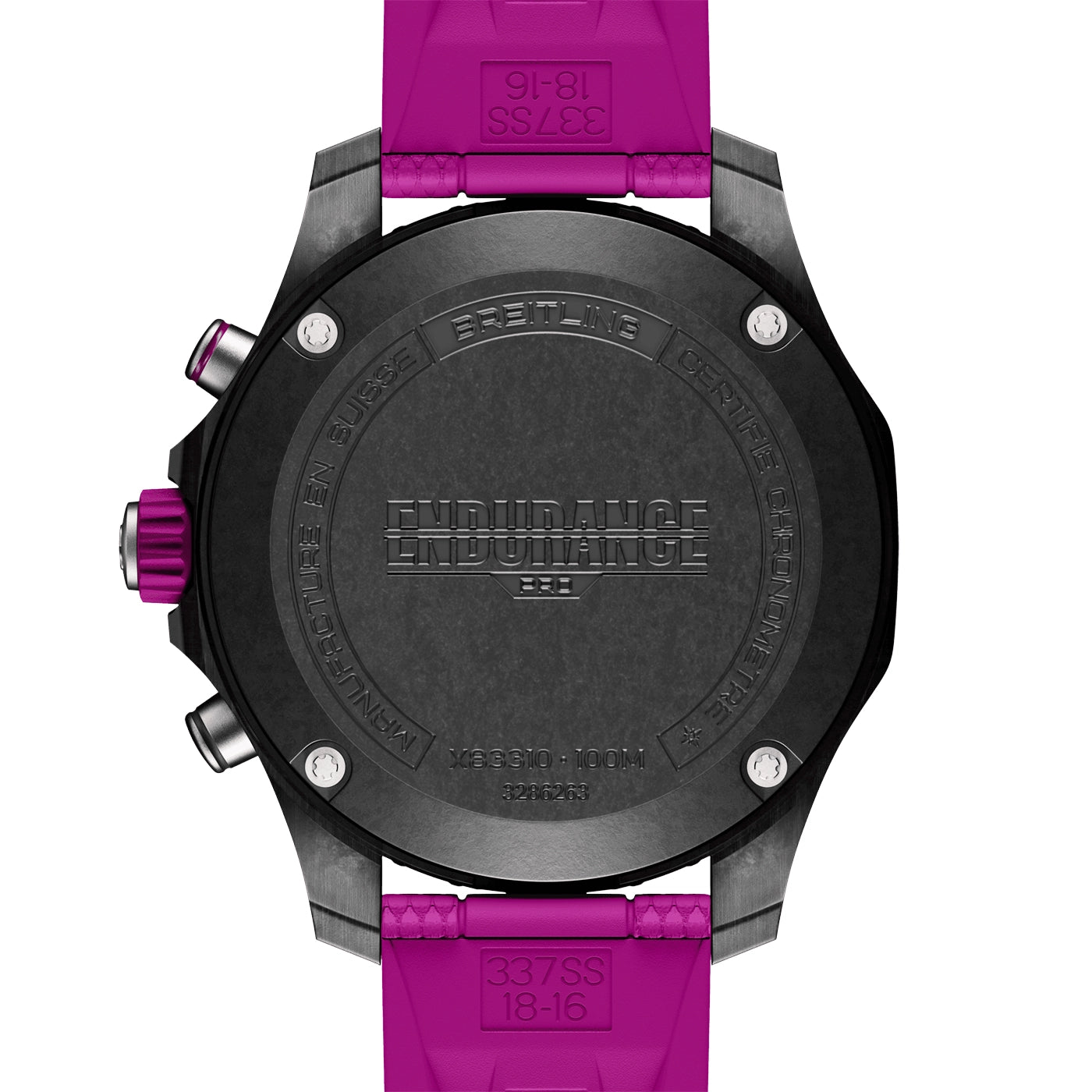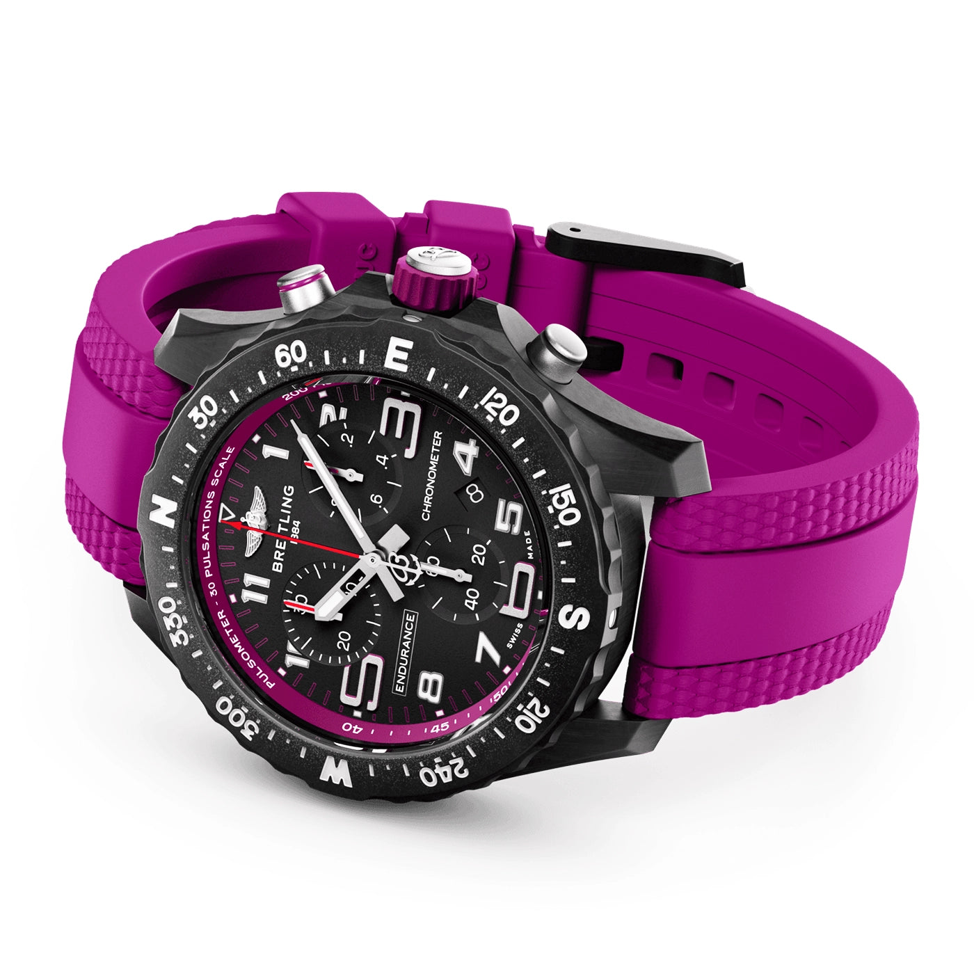 Breitling Endurance Pro 38mm Breitlight Black/Purple Rubber Strap Watch X83310F61B1S1. Breitlight 44mm case and bezel all on a purple rubber strap. This men's watch has a black dial with luminous applied hands and hour markers, date display at the 4:30 o'clock position. Sapphire crystal glass and water resistant up to 100m. Quartz chronograph movement.