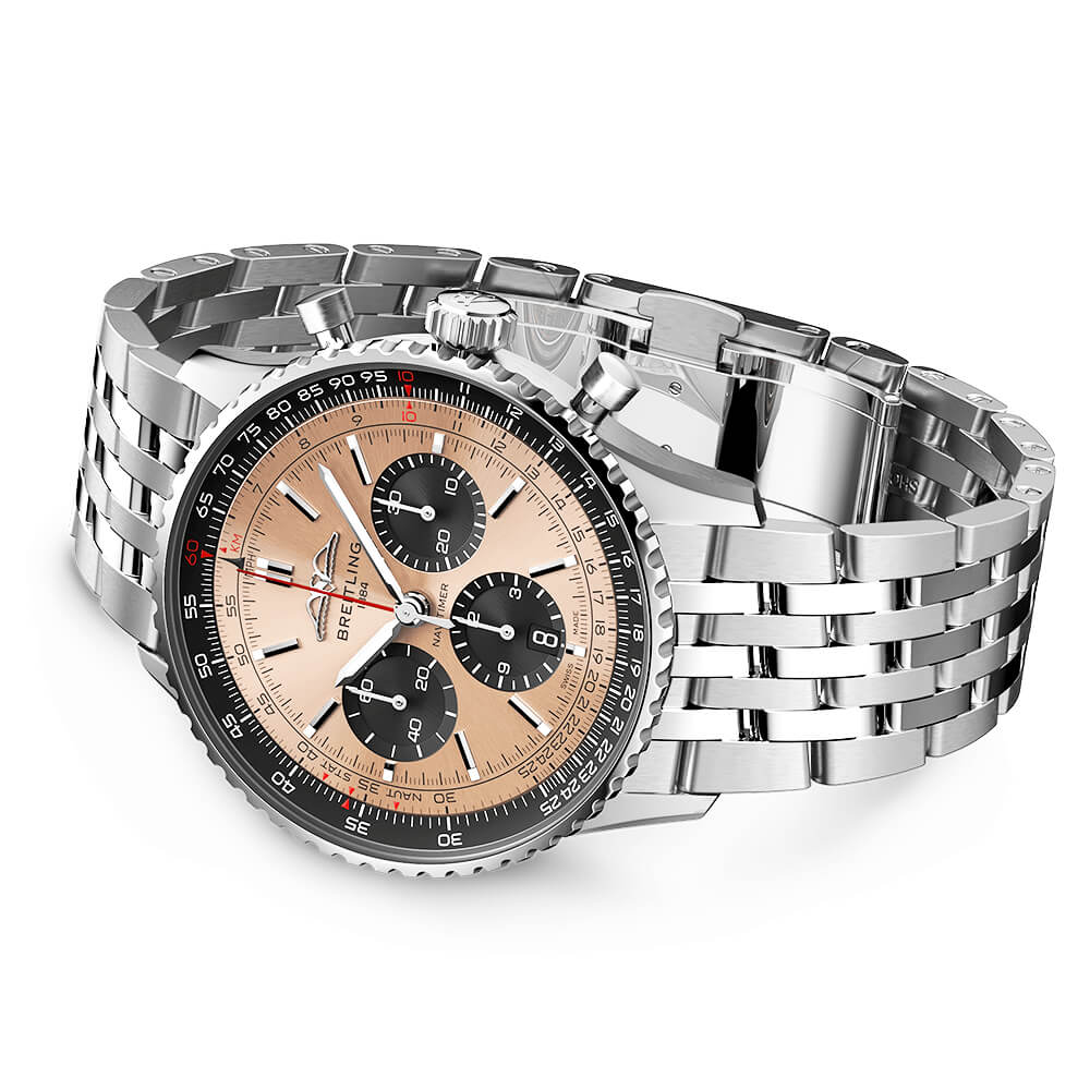 Breitling Navitimer 43mm Copper/Black Dial Chronograph Bracelet Watch AB0138241K1A1. Stainless steel 43mm case and bidirectional bezel. This men's watch has a copper dial with polished hands and hour markers, contrasting black sub dials and a date display at the 6 o'clock position. Water resistant up to 30m and sapphire crystal glass. Power reserve up to 70 hours. Breitling 01 calibre automatic chronograph movement.