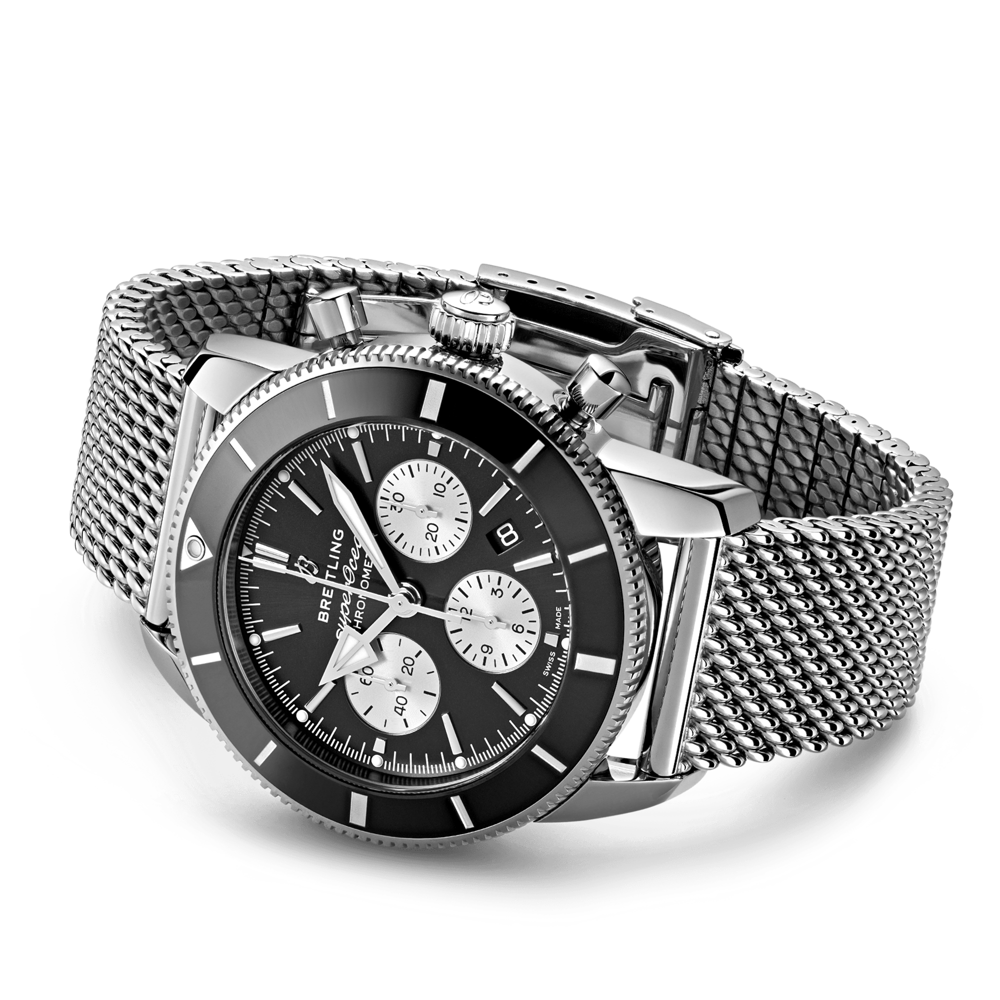 Breitling Superocean Heritage Chronograph 44mm Black Dial Bracelet Watch AB0162121B1A1. Stainless steel 44mm case and black ceramic bezel all on a steel ocean classic bracelet. This men's watch has a black dial with polished hands and hour markers, date display at the 4:30 o'clock position. Sapphire crystal glass and water resistant up to 200m. Power reserve up to 70 hours. Automatic chronograph movement.