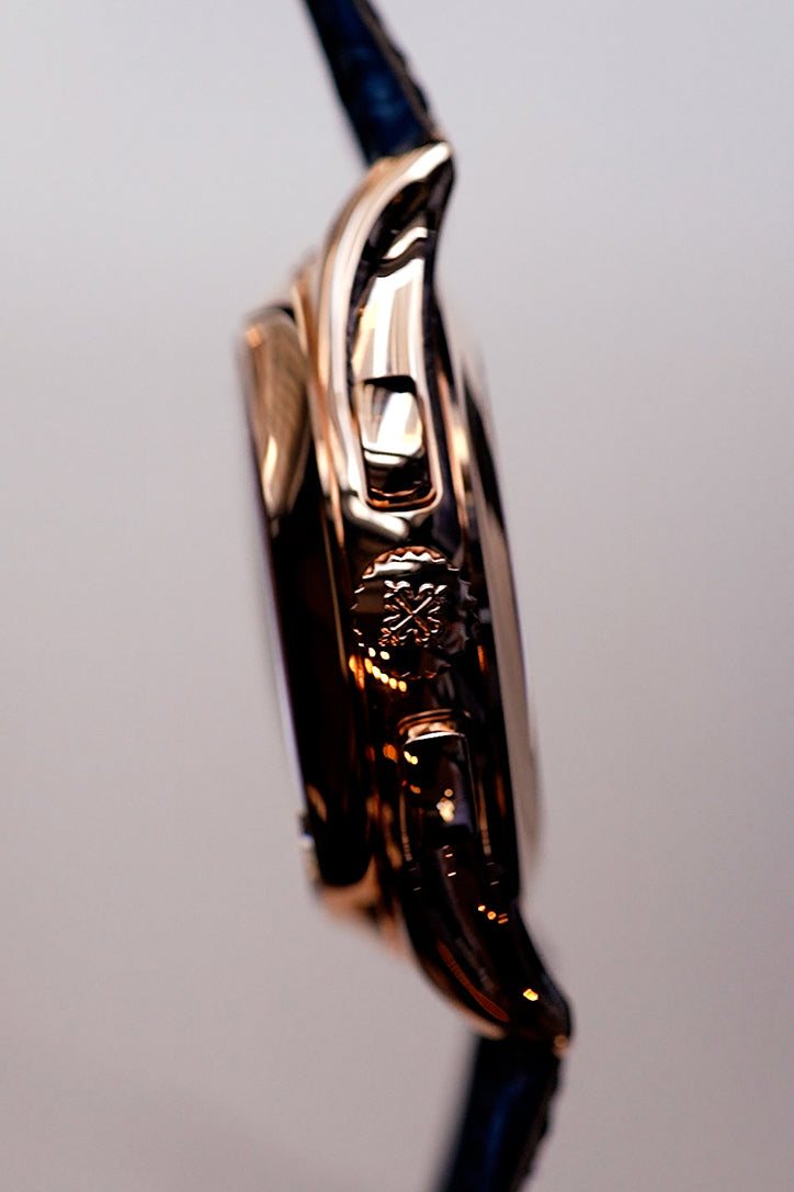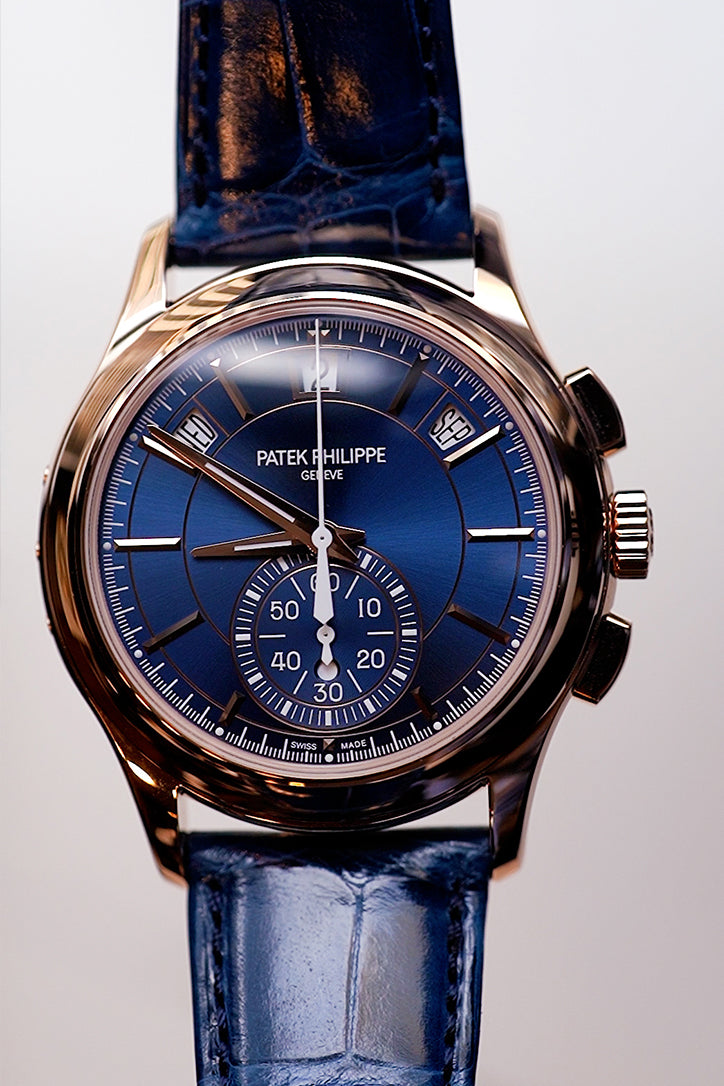 Patek Philippe Complications Chronograph Annual Calendar Mens Watches 5905R 5905R-010 Self-winding mechanical movement. Caliber CH 28520 QA 24H. Flyback chronograph. Central chronograph hand. 60-minute counter. Annual Calendar. Day, date, month and day/night indication displayed in apertures.Sunburst blue with gold applied faceted baton-style hour markers.Case Rose gold. Sapphire crystal case back. Water-resistant to 30 m. Diameter: 42 mm. Height: 14.03 mm.Strap Alligator leather with square scales, hand-stitched, shiny dark blue. Prong buckle.