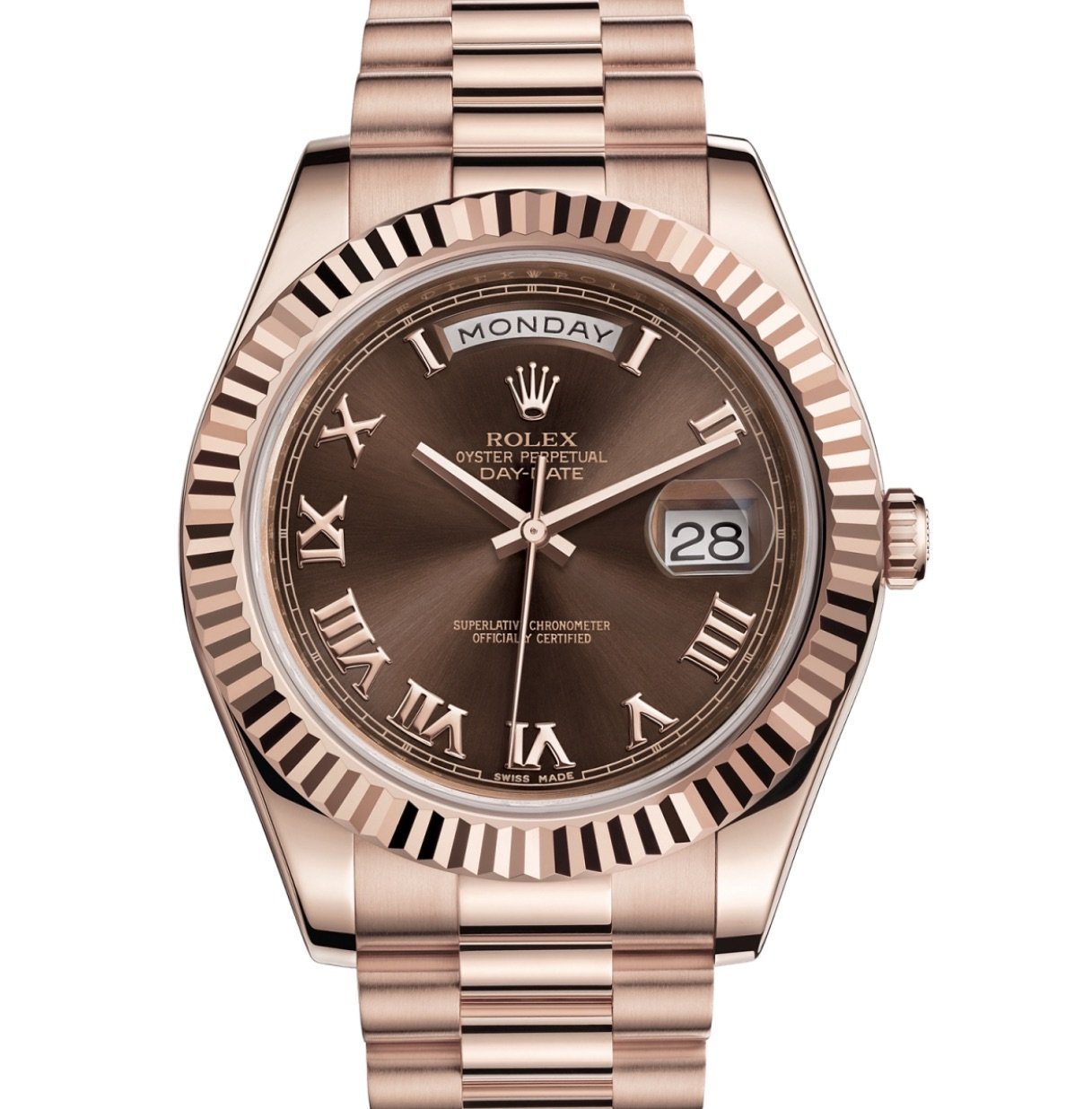 Replica Rolex Day-Date Rose Gold Chocolate Diamond Dial Fluted Bezel President Bracelet 228235