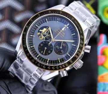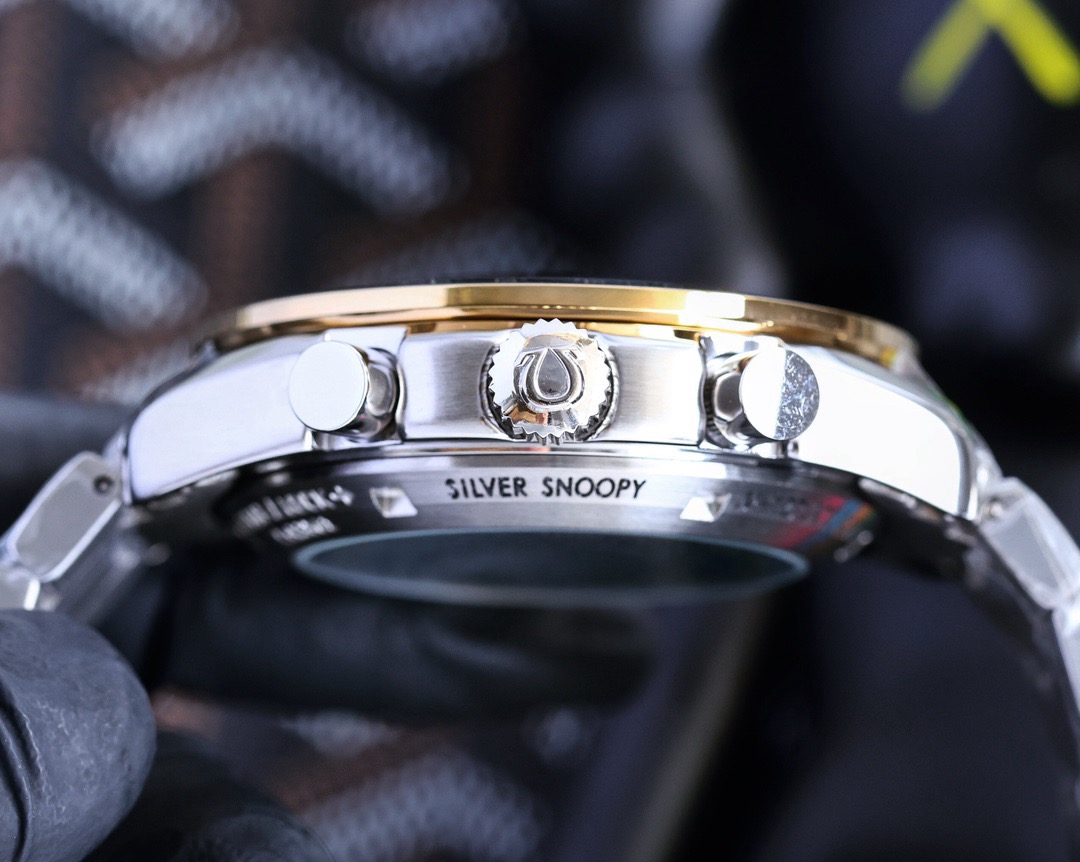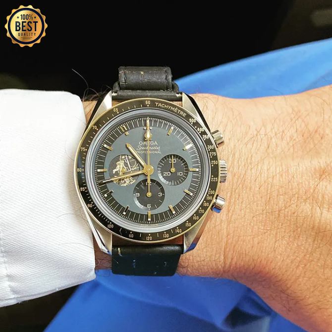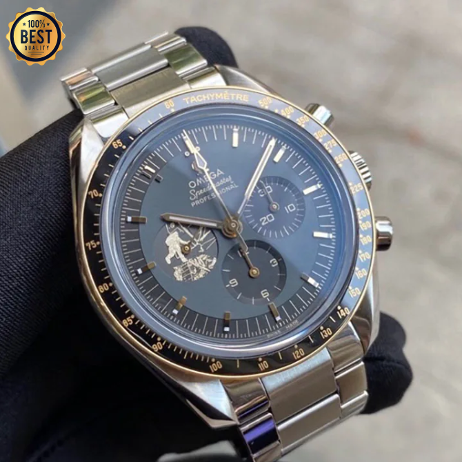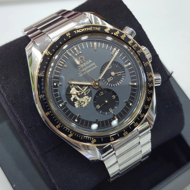 The watch includes a 42 mm case in stainless steel with a polished 18K Moonshine™ Gold bezel. The bezel ring is polished black ceramic [ZrO2] with an OMEGA Ceragold™ tachymeter scale. There is a varnished grey and black dial with all indexes and hands in 18K Moonshine™ Gold - except the central chronograph seconds hand, which is PVD-coated in Moonshine Gold. A unique hour marker is positioned at 11 o'clock, and there is a distinctive 9 o'clock subdial in 18K Moonshine™ Gold with a laser-engraved image of Buzz Aldrin climbing down onto the lunar surface.