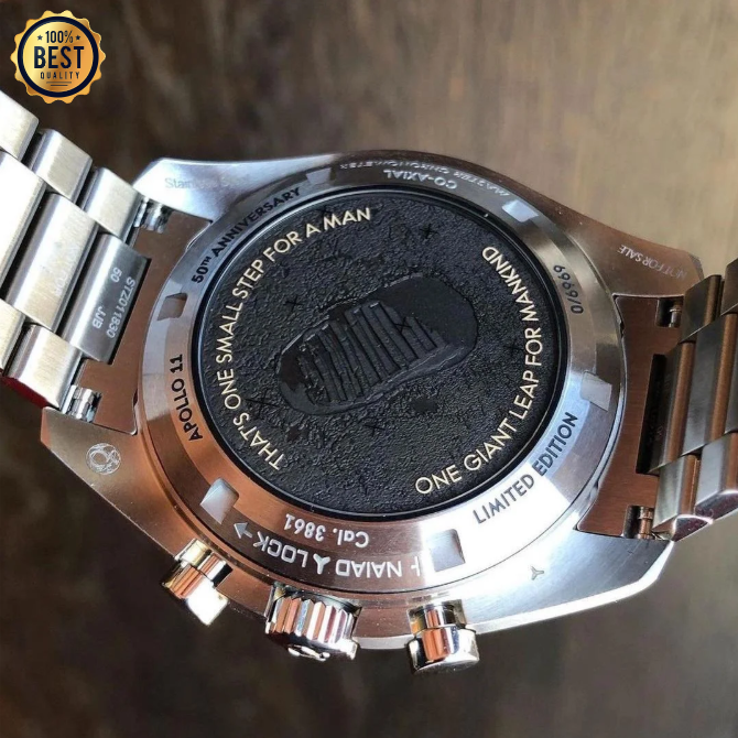 The NAIAD LOCK caseback reveals numerous engravings, while a laser-engraved image of Buzz Aldrin’s footprint is positioned on a medallion under the sapphire crystal. 18K Moonshine™ Gold-plated lettering includes the quote: "THAT’S ONE SMALL STEP FOR A MAN" and "ONE GIANT LEAP FOR MANKIND".