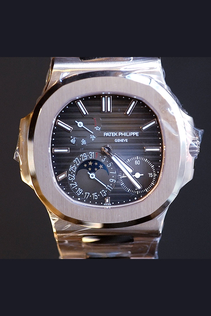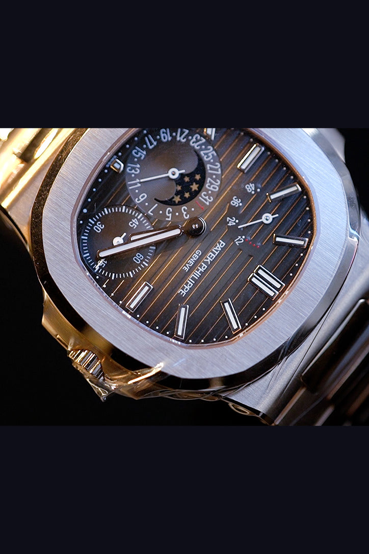 Patek Philippe Nautilus Moon Phase Rose Gold Watch 5712/1R-001 5712/1RSelf-winding mechanical movement. Caliber 240 PS IRM C LU. Date by hand. Moon phases. Power reserve indication. Small seconds. Dial Sunburst brown, black-gradient rim, horizontally embossed, gold applied hour markers with luminescent coating. Case Rose gold. Screw-down crown. Sapphire crystal case back. Water-resistant to 60 m. Diameter (10–4 o’clock): 40 mm. Height: 8.52 mm.