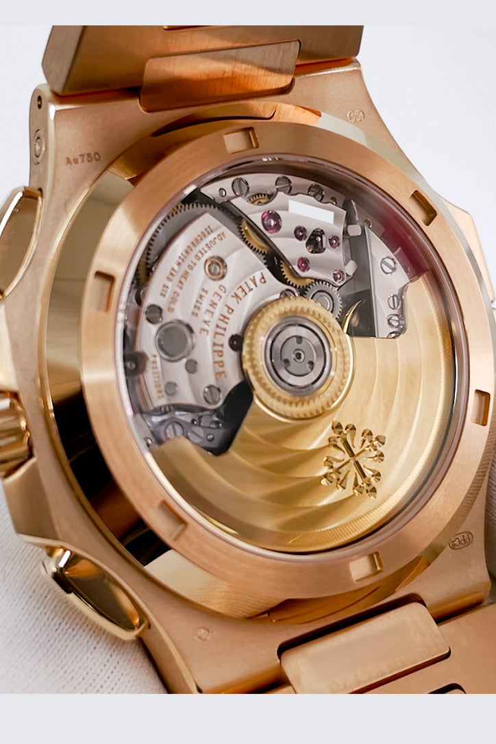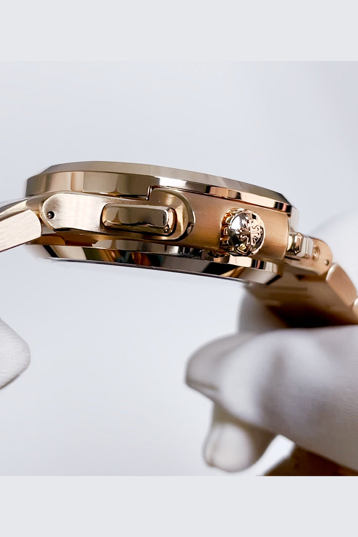 Patek Philippe presents the Nautilus Travel Time Chronograph Reference 5990/1 in a generous rose gold version contrasting with the sunburst blue dial featuring an embossed horizontal pattern and applied hour-markers. The baton-style hands are in rose gold with a luminescent coating. This new model combines three highly sought-after complications: a self-winding flyback chronograph, an easy-to-use Travel Time function (dual time-zone), and a date display, coupled with local time. Self-winding mechanical movement. Caliber CH 28520 C FUS. Flyback chronograph. Central chronograph hand. 60-minute counter. Two time zones: local and home time indication. Day/night indication for local time and home time in apertures. Date coupled with local time by hand.Sunburst blue, gold applied hour markers with luminescent coating.Rose gold. Screw-down crown. Sapphire-crystal case back. Water-resistant to 120m. Case diameter (10 - 4 o’clock): 40.5 mm. Height: 12.53 mm. Rose gold. Nautilus fold-over clasp.5990/1R-0015990-1R-0015990/1R 2021 model