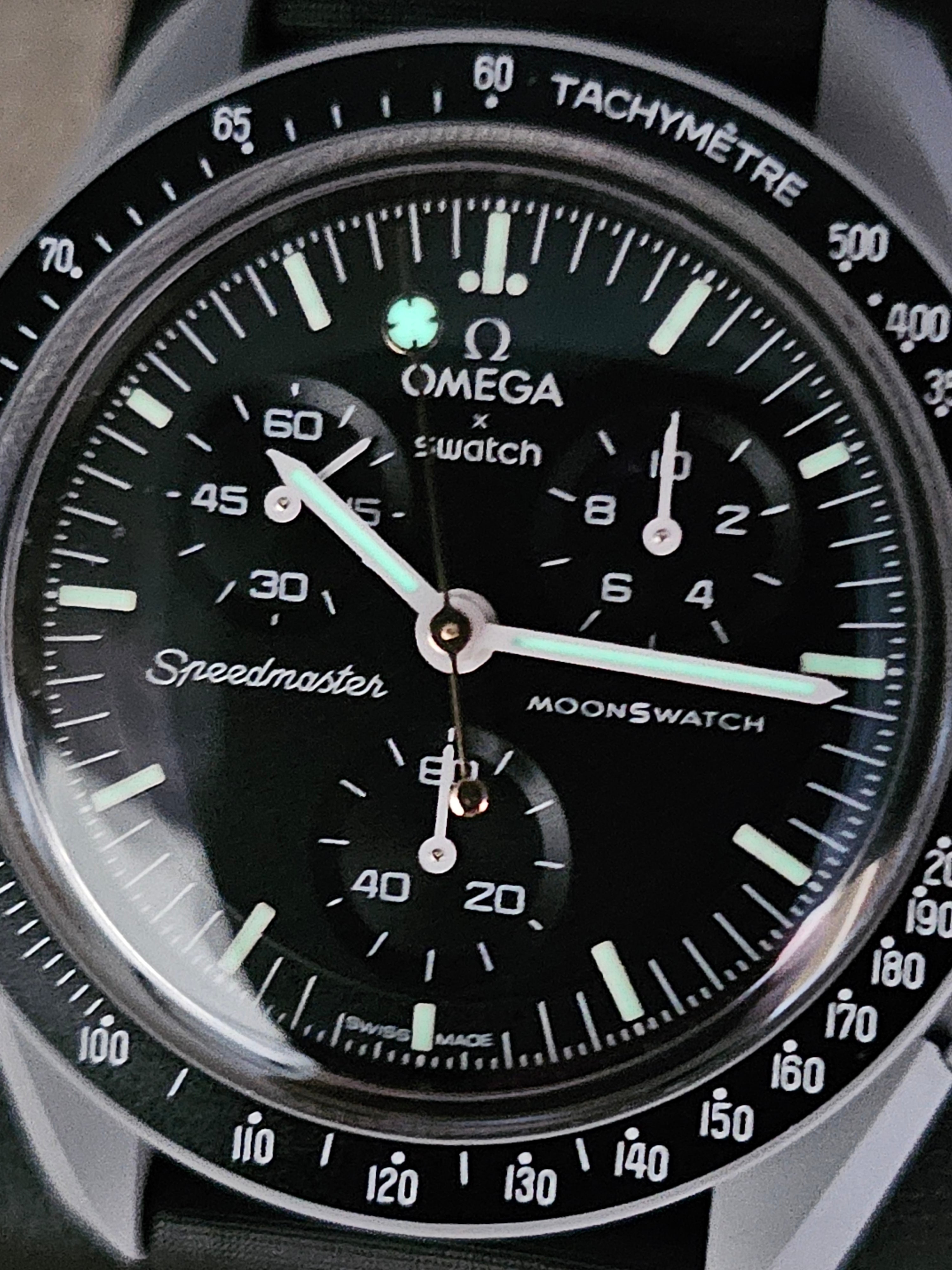 Discover the "Mission to the Moon" timepiece, a captivating creation featuring a lollipop second hand, meticulously crafted from Swatches exclusive Moonshine Gold. This exquisite detail harbors a luminous secret signature, visible only in the dark, paying homage to the iconic OMEGA Speedmaster CK 2998-3 FAP. This particular model marked the last of the 2998 reference, distinguished by its chronograph lollipop second hand.
