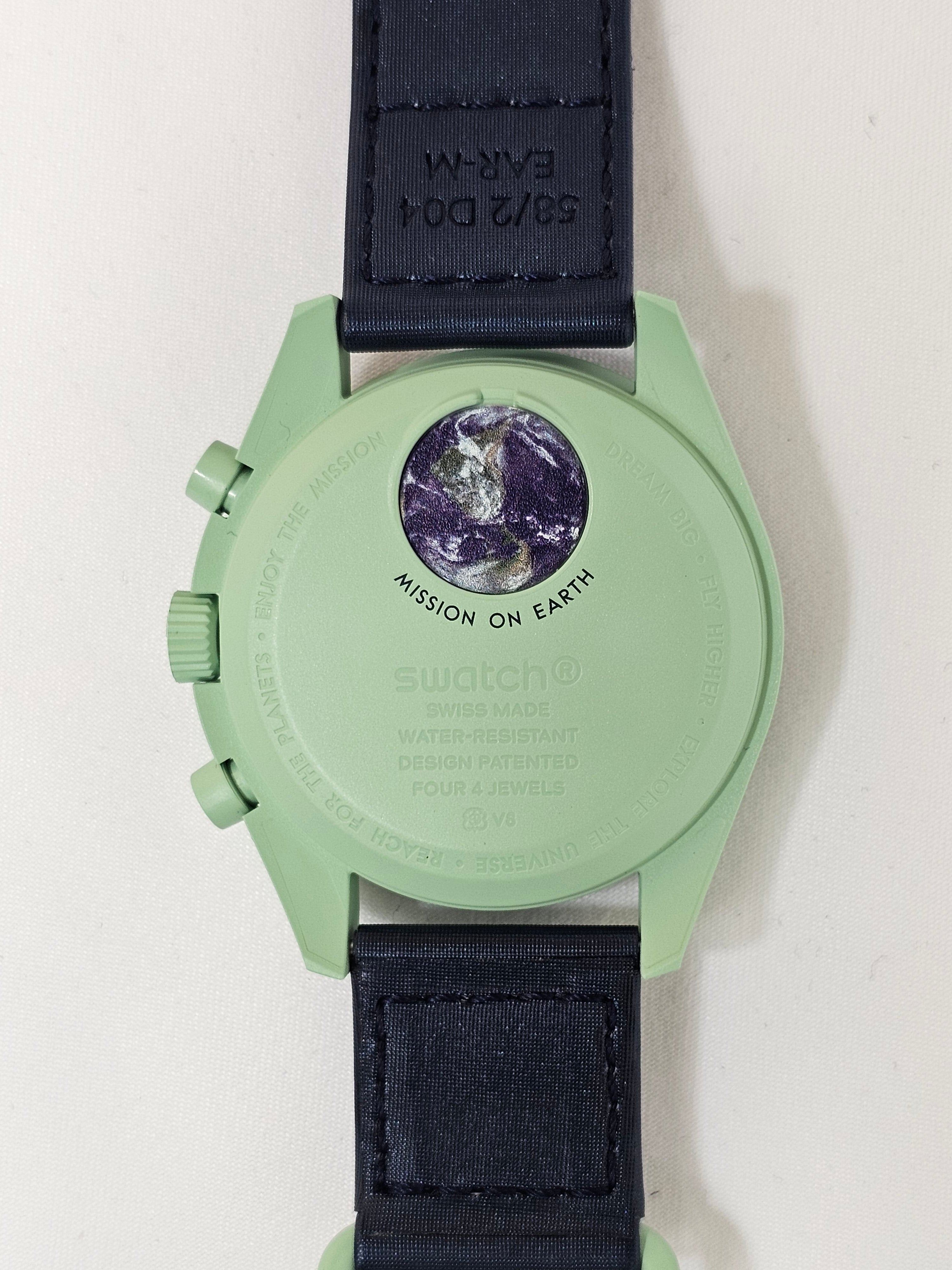For eco-astronaut enthusiasts, this watch is a must-have. Its earthy green hue harmonises with a navy blue VELCRO strap. The chronograph seconds hand and counter hands adopt a rich brown, while subdials are pristine white. The blue tachymeter scale on the bezel exudes a celestial charm. All dials proudly showcase OMEGA X SWATCH branding, the iconic Speedmaster logo, and the new MoonSwatch emblem.