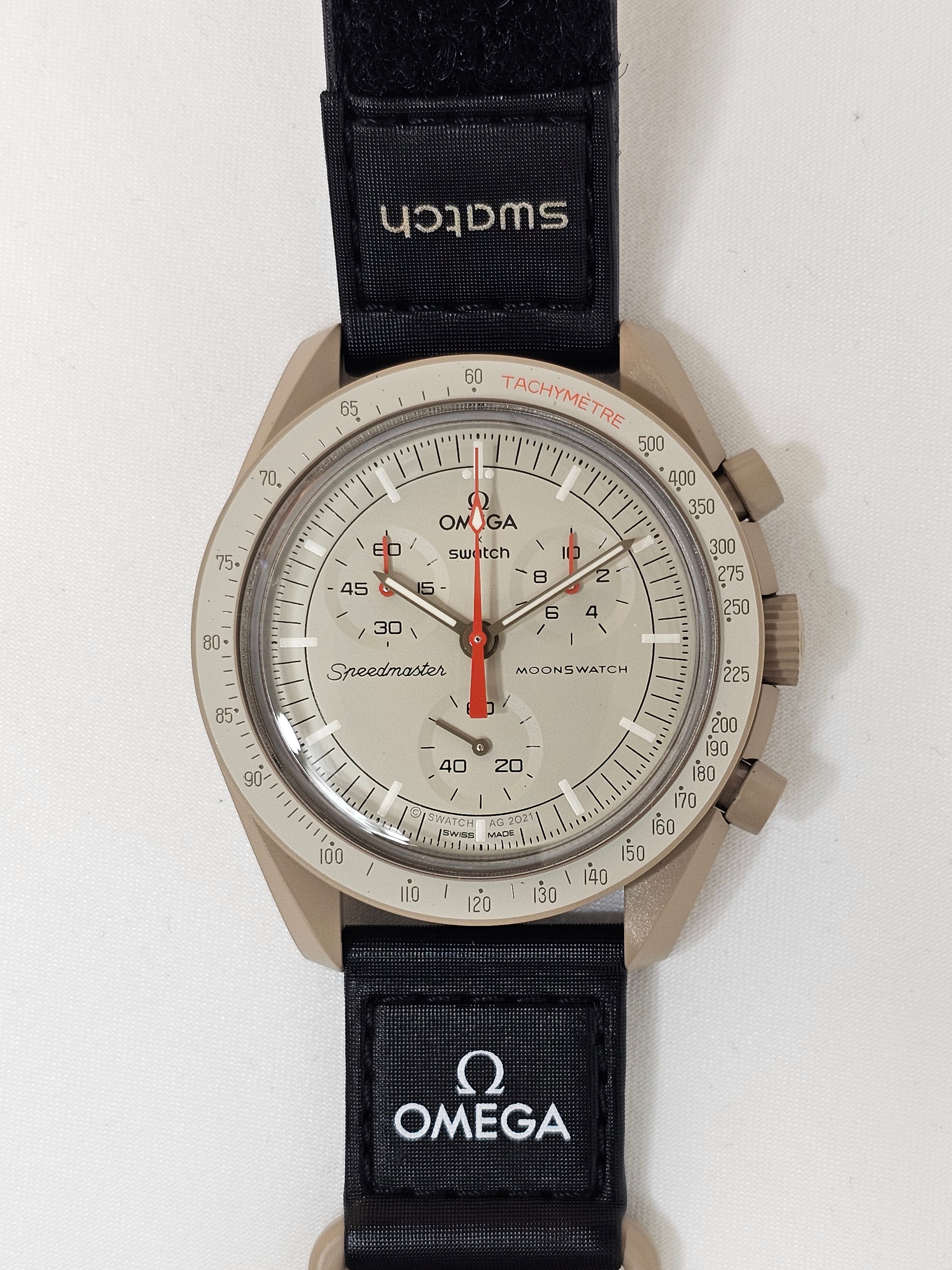For aficionados of timeless elegance, this watch exudes sophistication with its beige tones complemented by a black VELCRO strap. The chronograph seconds hand and subdial hands add a vibrant touch in orange. Each dial proudly displays OMEGA X SWATCH branding, the iconic Speedmaster logo, and the new MoonSwatch emblem.