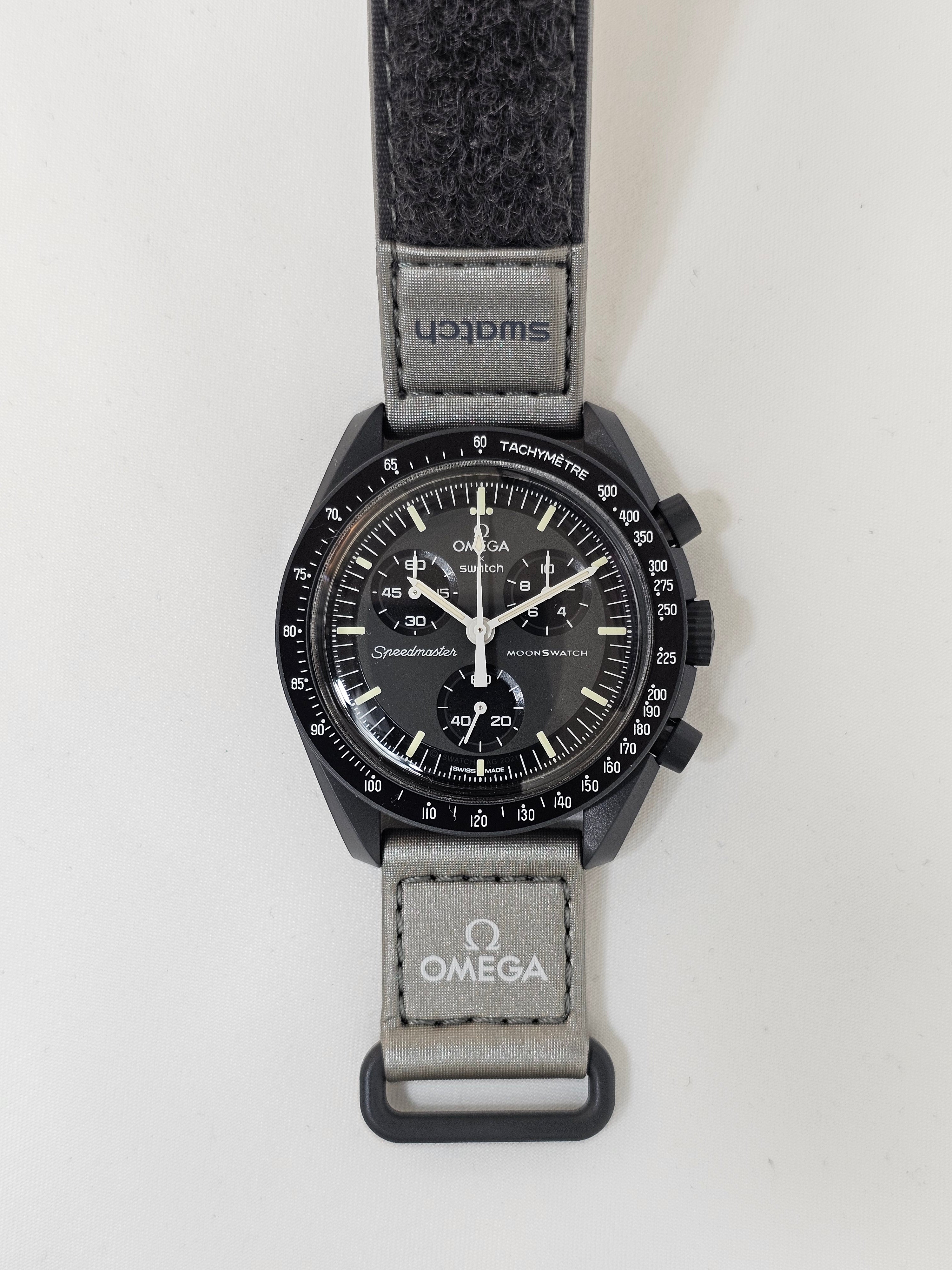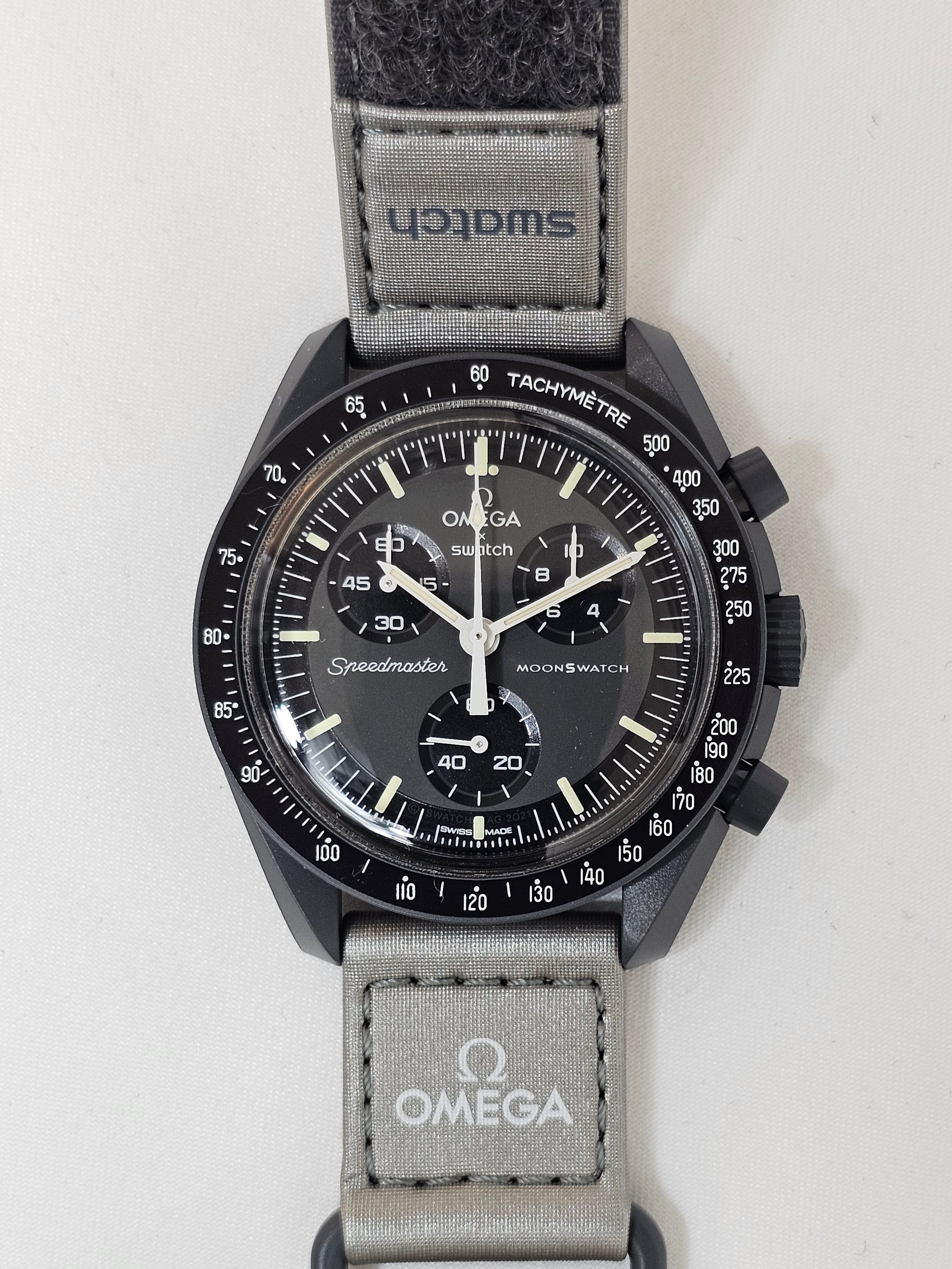 Dials proudly display OMEGA X SWATCH branding, the iconic Speedmaster logo, and the new MoonSwatch emblem. Precision abounds, from the concealed "hidden" S beneath the crystal to the circular pattern on the dial's outer ring and subdials.