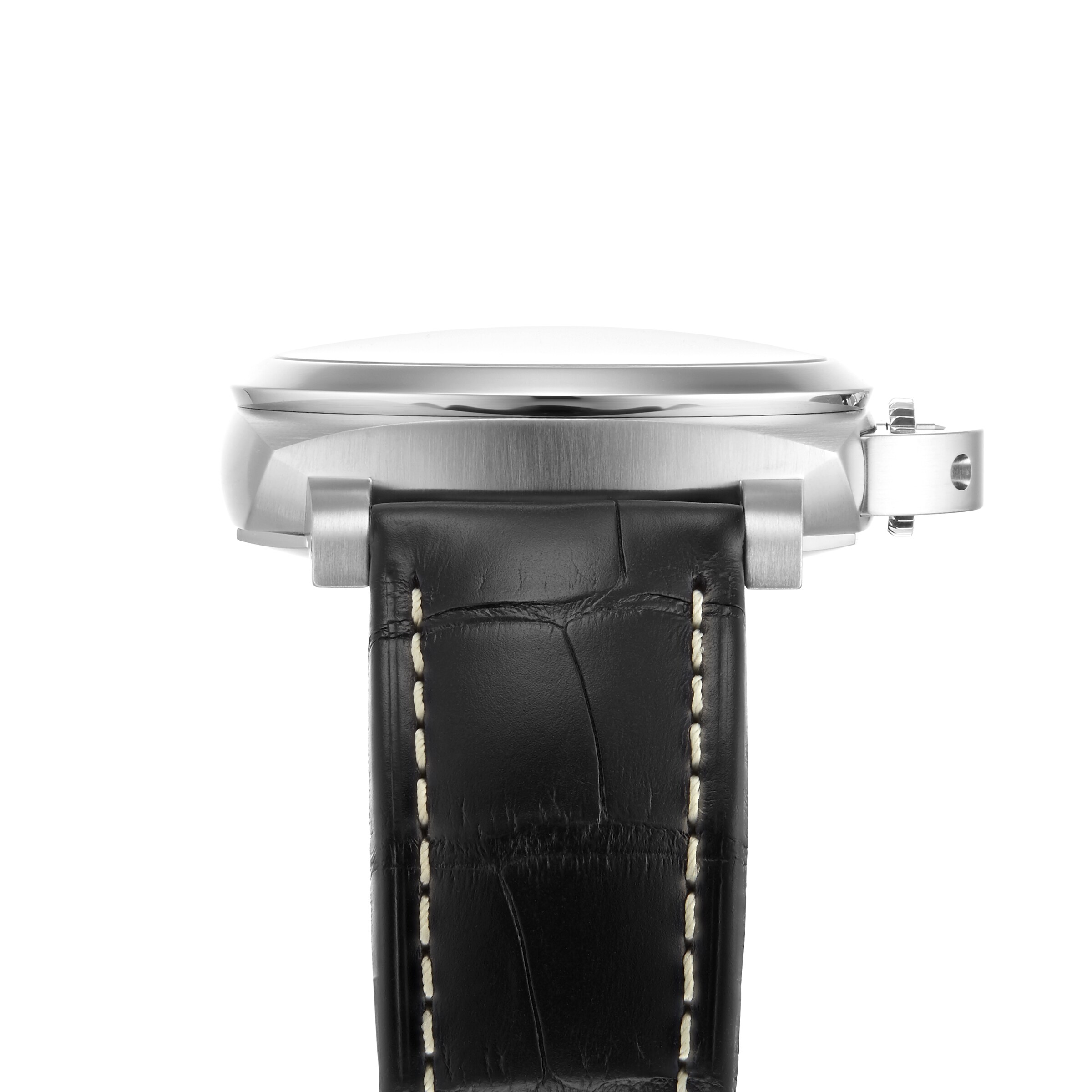 Embracing a classic sense of style, this timepiece features a bold black dial complemented by a black alligator leather strap with contrasting ecru stitching.