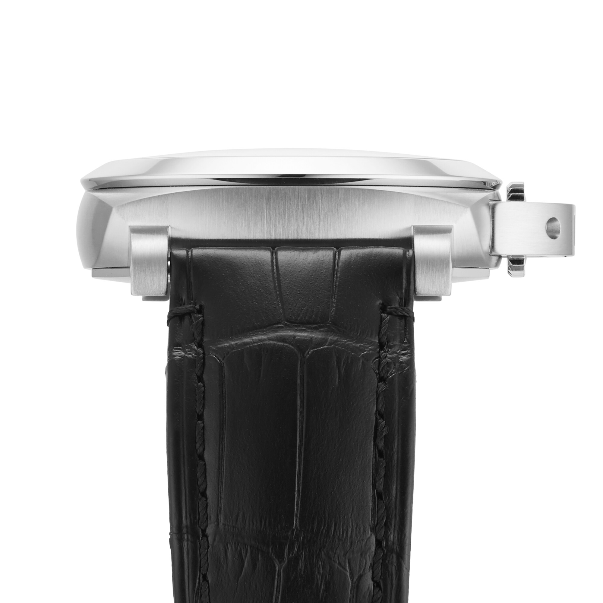 An ode to luxurious yet functional timekeeping, this Luminor Quaranta model is presented in a robust 40mm polished steel case with a complementary black alligator leather strap.