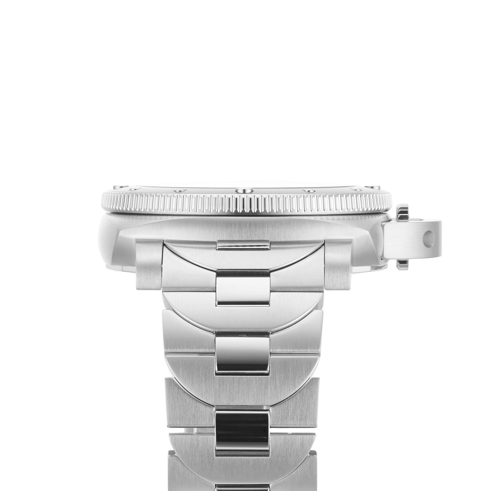 Providing further functionality, the blue ceramic anti-clockwise rotating bezel with graduated scale provides optimum tracking. Presented on a stainless steel bracelet, this timepiece blurs the line between function and form.