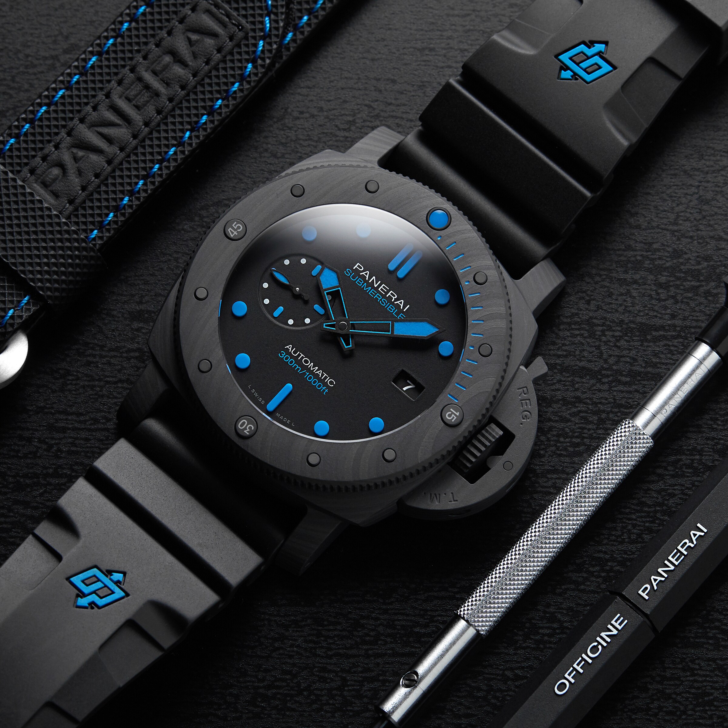 The Panerai Submersible Carbotech 47mm Mens Watch PAM01616 features a 47mm carbon fibre case, showcasing a black dial and sapphire crystal glass. This timepiece also incorporates a rubber strap, finished with a deployment clasp for added security.