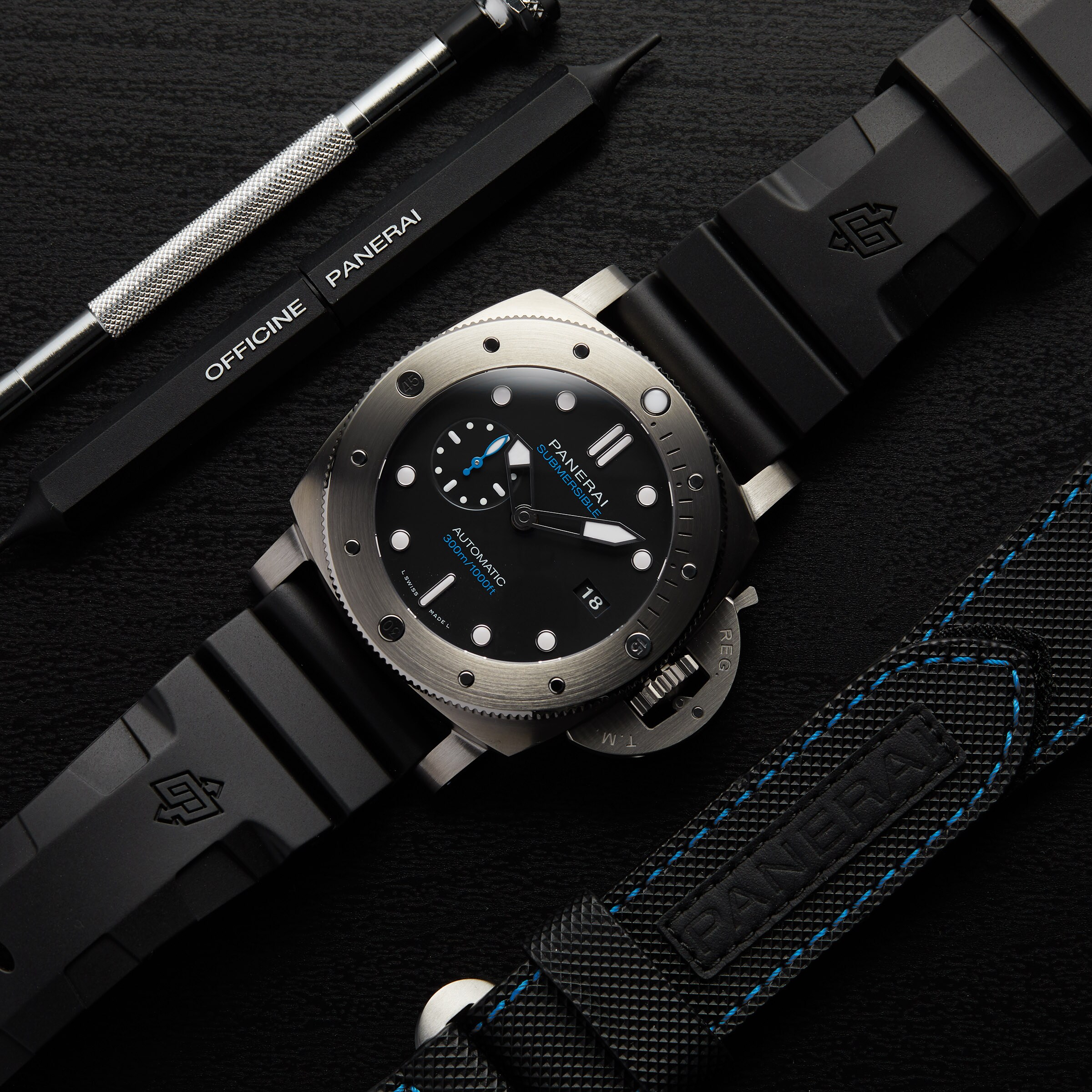 Water resistant to an incredible 300 meters, this performance driven watch is presented in a 47mm titanium case and features a sophisticated black dial with a date display window at 3 oclock and a sub-dial with blue accents at 9 oclock.