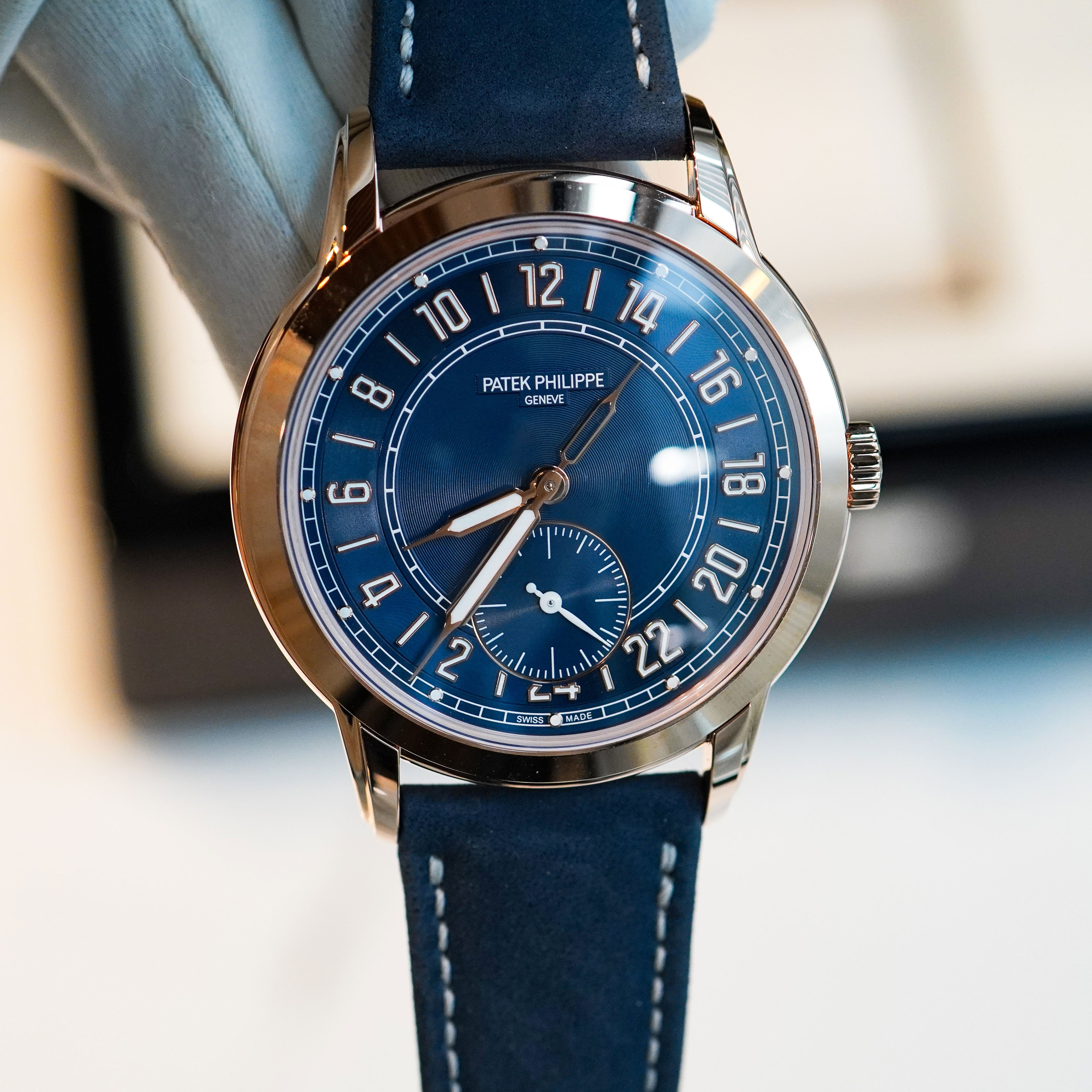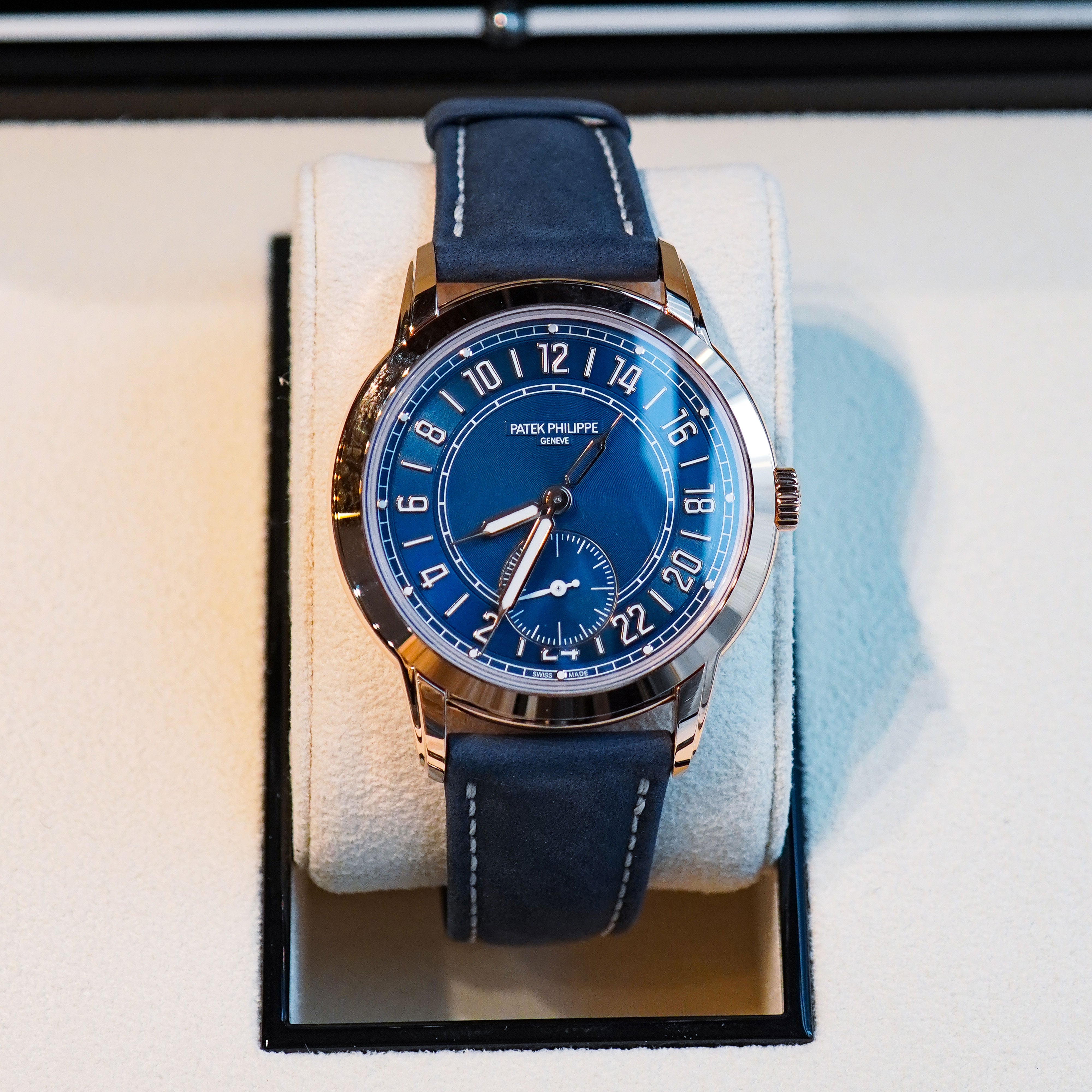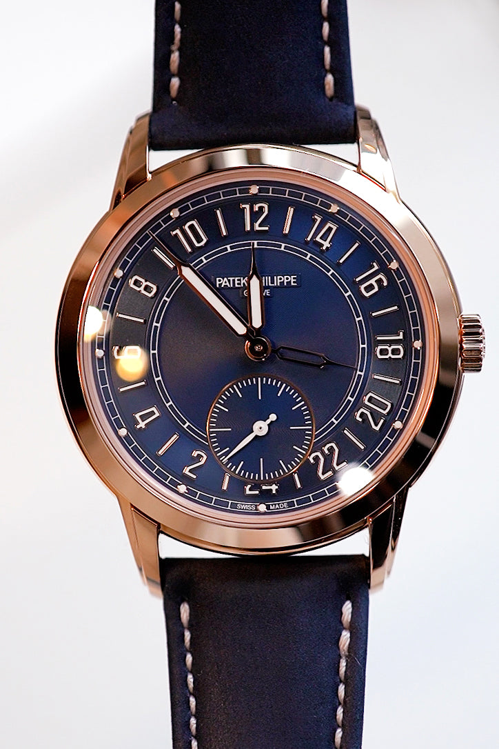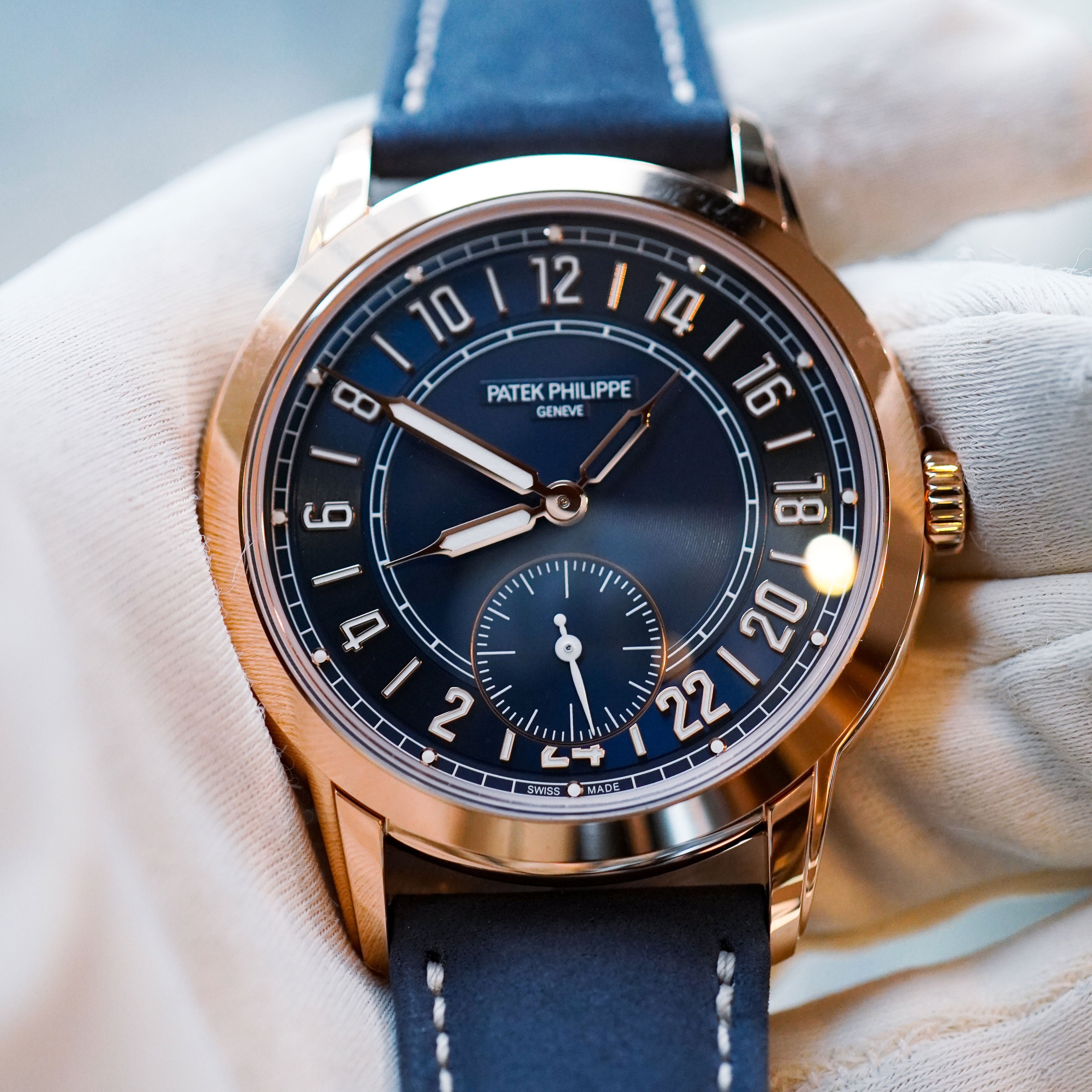 Patek Philippe Complication Blue Dial Watch 5224R-001 enriches its range of travel watches and complications for everyday use with a new self-winding Calatrava Travel Time model featuring a distinctive 24-hour display. Self-winding mechanical movement. Caliber 31260 PS FUS 24H. Dual time zone: local and home time indication. 24-hour display. Small seconds. Blue dial, gold applied numerals and hour markers and cabochons with white luminescent coating. Rose gold Case. Sapphire crystal case back. Water-resistant to 30 m. Diameter: 42 mm. Height: 9.85 mm. Calfskin Strap, nubuck finish, hand-stitched, navy blue. Prong buckle.