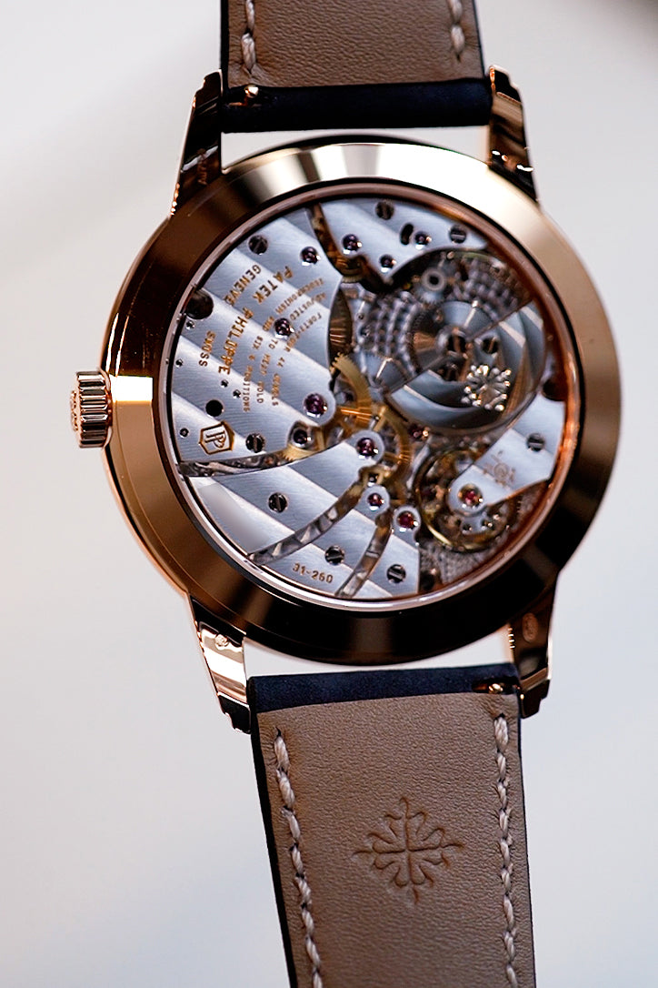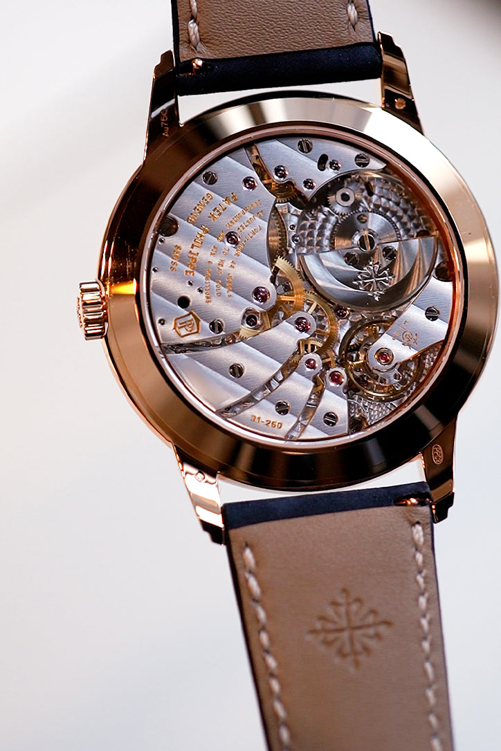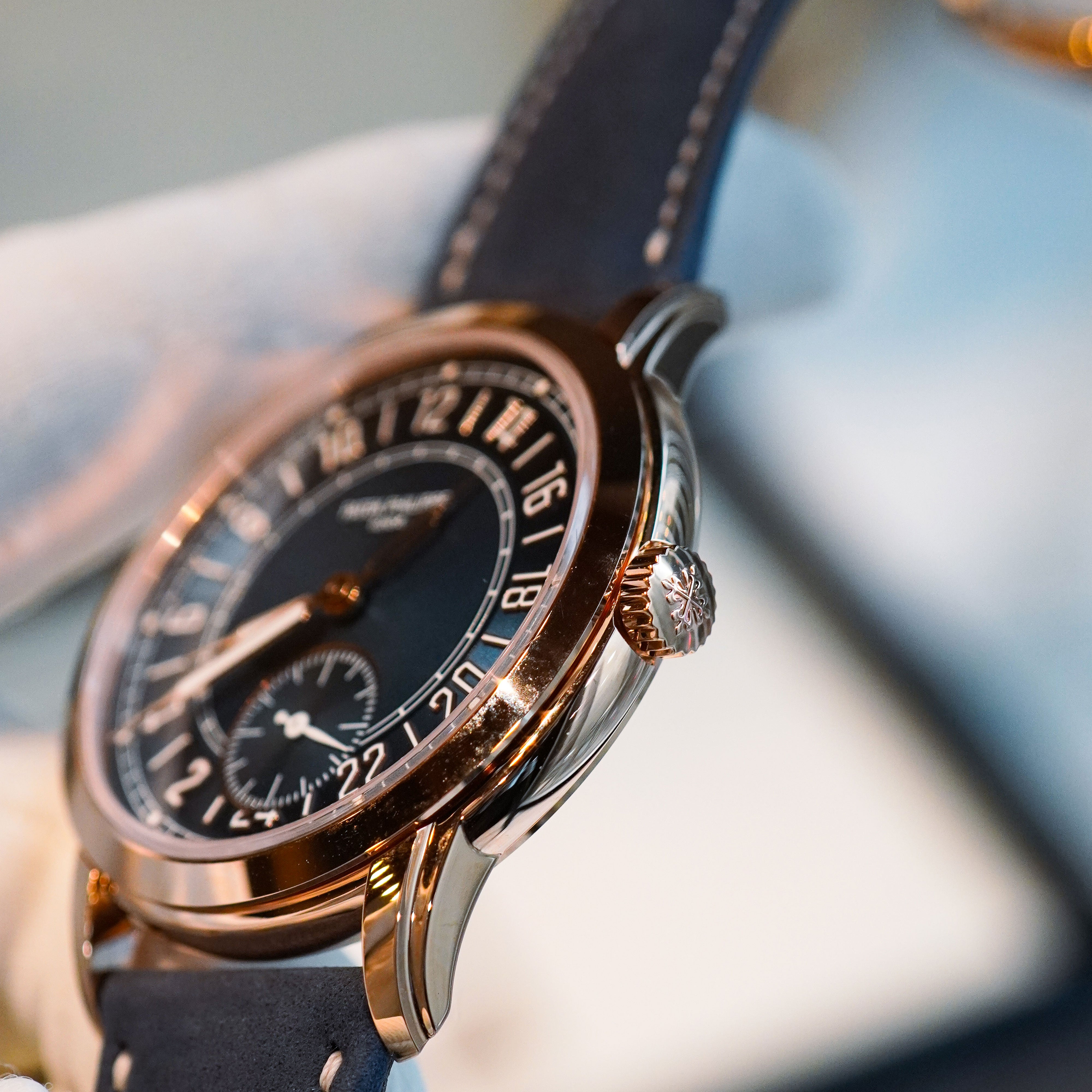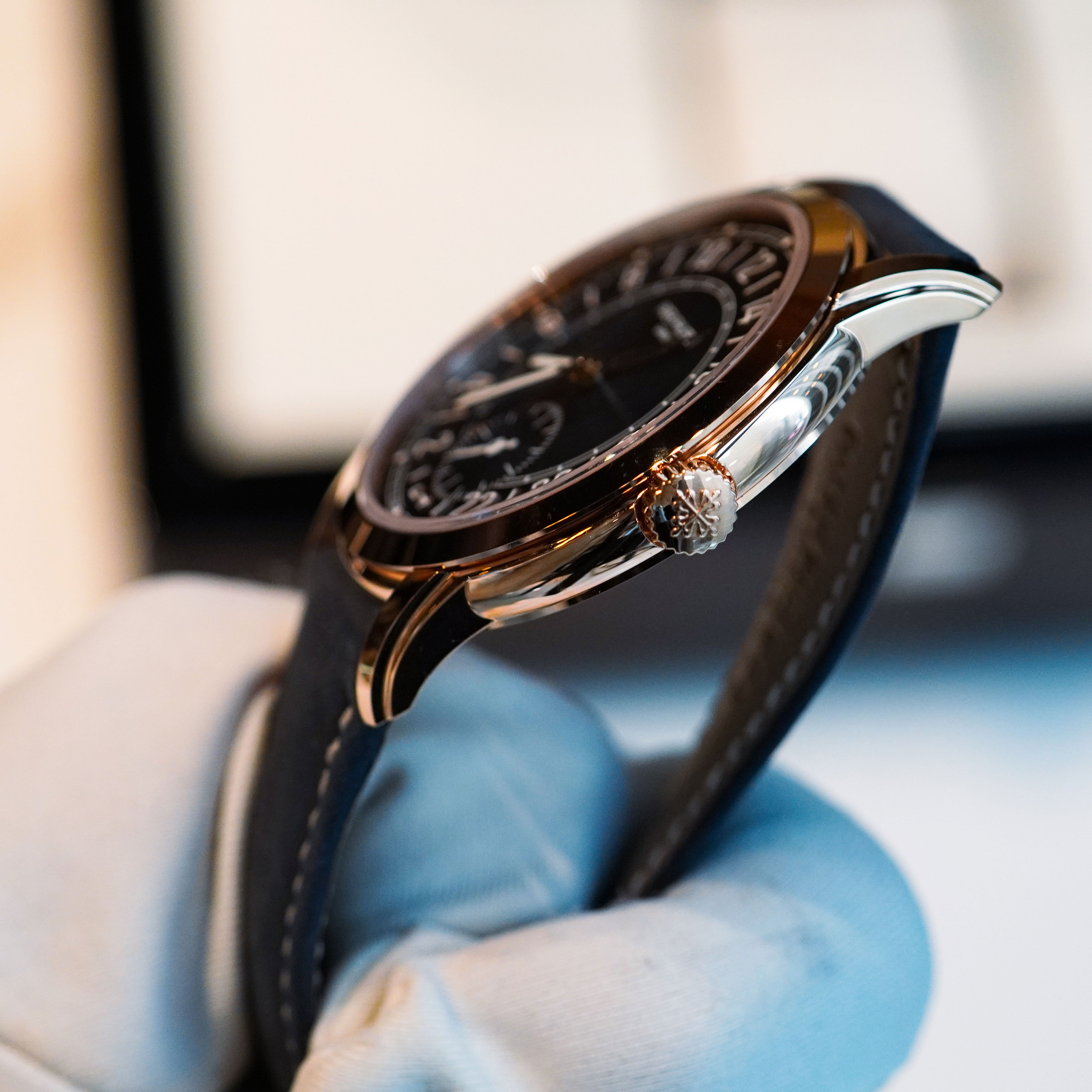 Patek Philippe Complication Blue Dial Watch 5224R-001 enriches its range of travel watches and complications for everyday use with a new self-winding Calatrava Travel Time model featuring a distinctive 24-hour display. Self-winding mechanical movement. Caliber 31260 PS FUS 24H. Dual time zone: local and home time indication. 24-hour display. Small seconds. Blue dial, gold applied numerals and hour markers and cabochons with white luminescent coating. Rose gold Case. Sapphire crystal case back. Water-resistant to 30 m. Diameter: 42 mm. Height: 9.85 mm. Calfskin Strap, nubuck finish, hand-stitched, navy blue. Prong buckle.