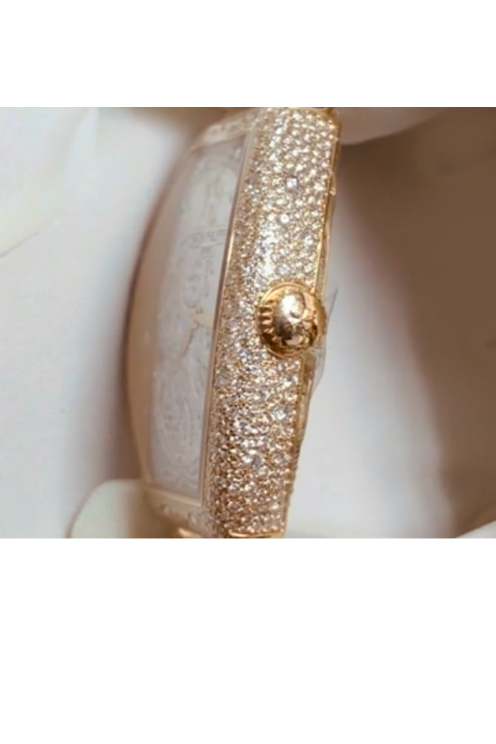 18kt rose gold set with 480 diamonds (3.31 ct.) case with a brown alligator leather strap. Fixed 18kt rose gold diamond set bezel. Gold set with 367 diamond (0.56 ct.) dial with gold-tone leaf-style shape hands and index hour markers. Minute markers around the inner ring. Dial Type: Analog. Patek Philippe Calibre 25-21 REC Hand Wind movement, composed of 142 parts, bitting at 28800 vph, and has a power reserve of approximately 44 hours. Scratch resistant sapphire crystal. Pull / push crown. Transparent case back. Tonneau case shape. Case size: 38.9 mm x 29.6 mm. Water resistant at 30 meters / 100 feet. Functions: hour, minute. Luxury watch style. Watch label: Swiss Made. Item Variations: 7099R 001, 7099R.001, 7099R001. Patek Philippe Gondolo Mechanical Gold and Diamond Dial Ladies Watch 7099R-001