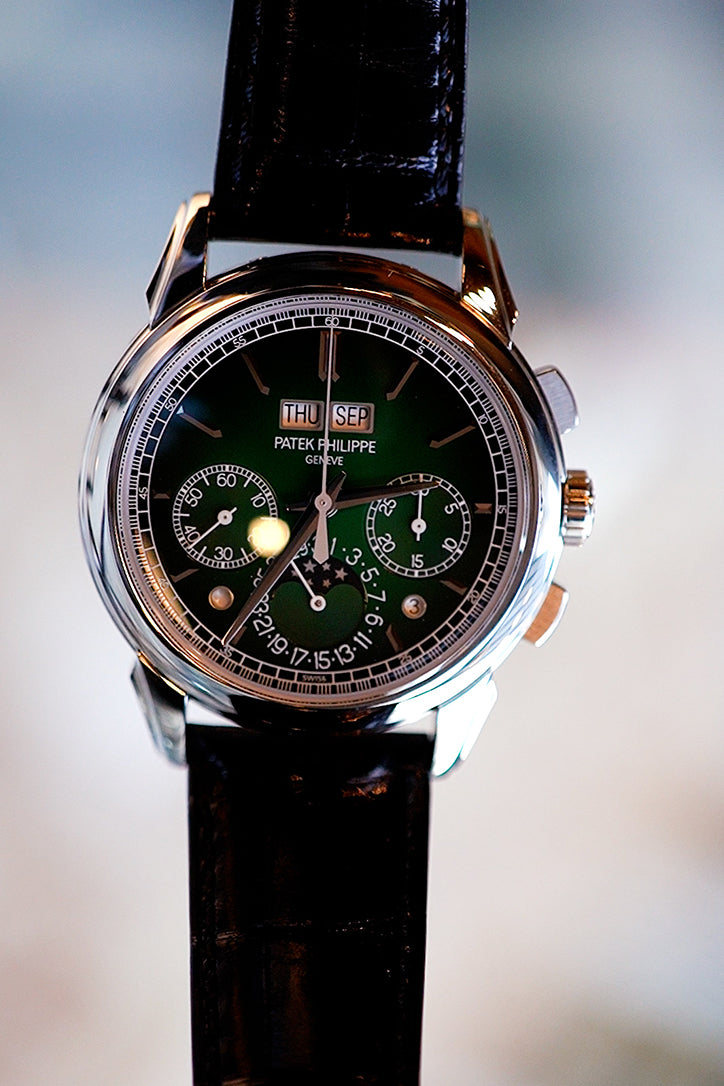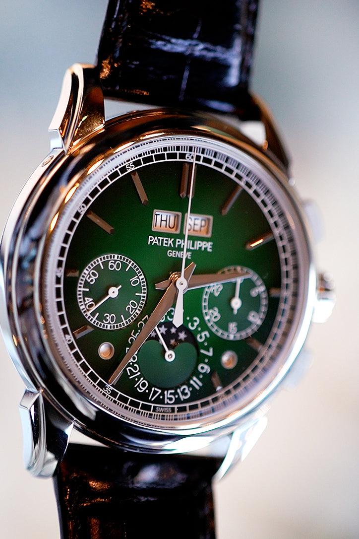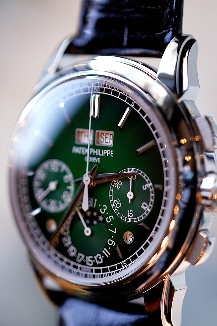 Patek Philippe Grand Complications Perpetual Calender Chronogragh 5270P-014 5270PManually wound mechanical movement. Caliber CH 29535 PS Q. Chronograph. Central chronograph hand. Instantaneous 30-minute counter. Perpetual Calendar. Day, month, leap year and day/night display in apertures. Date by hand. Moon phases. Seconds subdial.Dial Laquered green, black-gradient rim, gold applied hour markers. Case Platinum. Interchangeable full back and sapphire crystal case back. Water-resistant to 30 m. Diameter: 41 mm. Height: 12.4 mm.