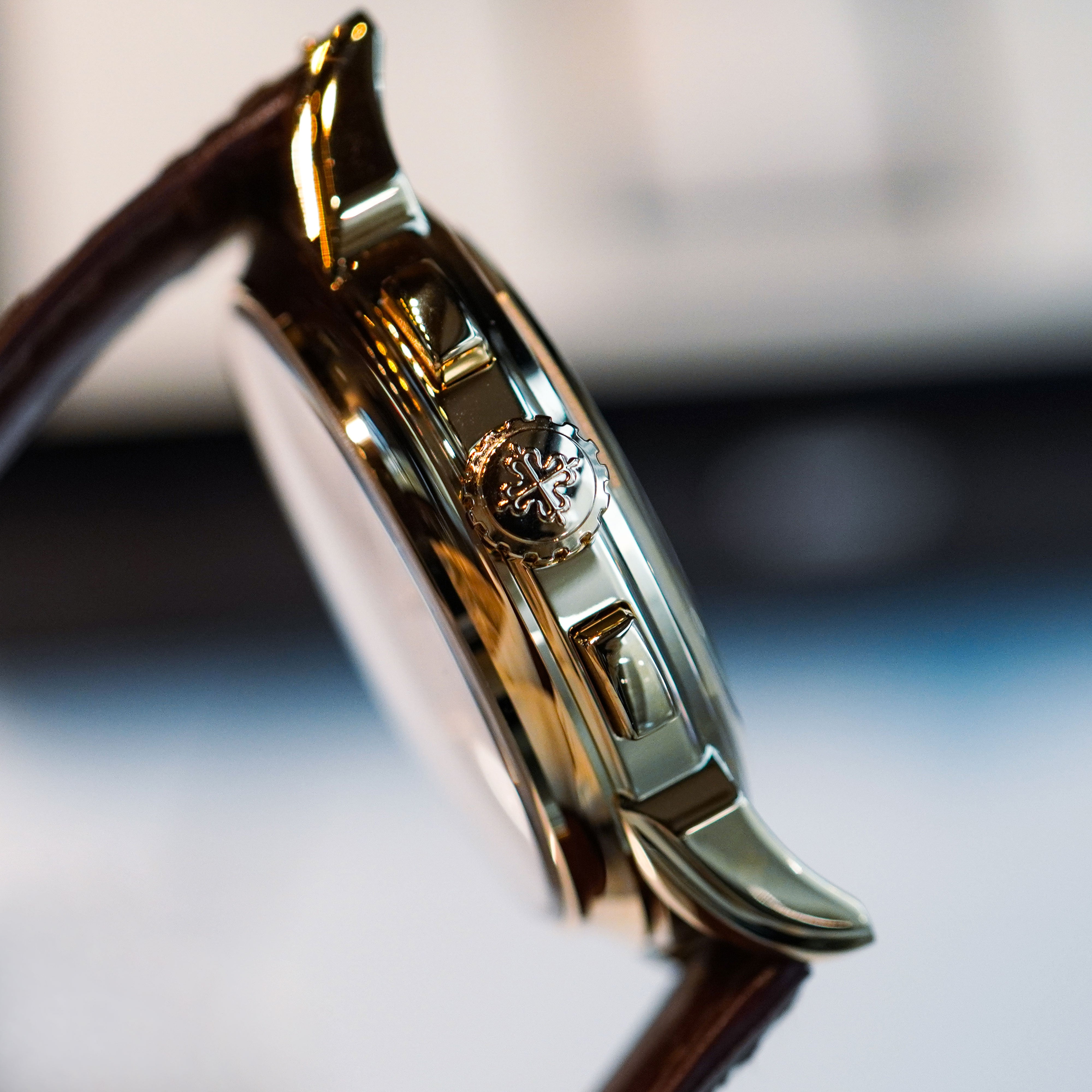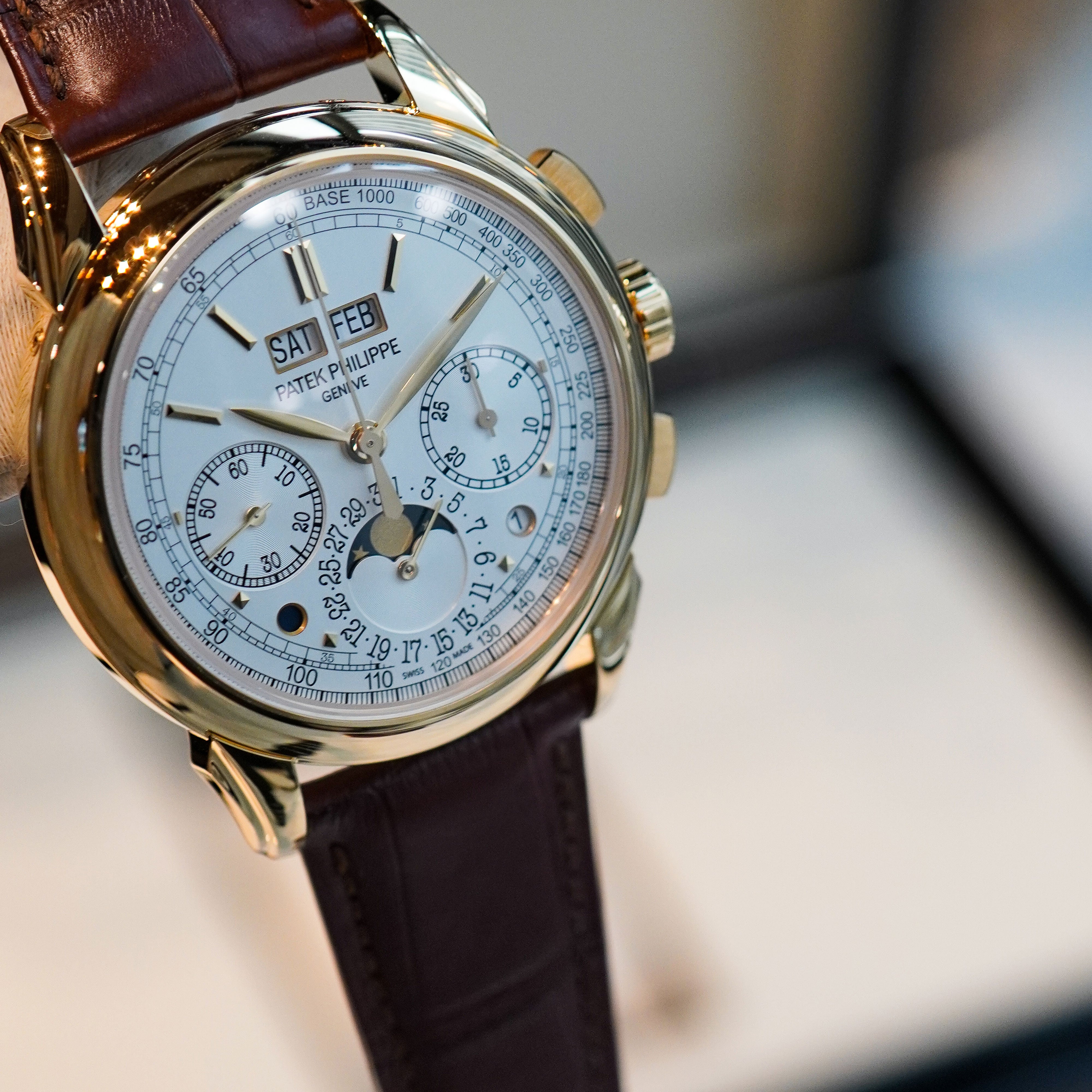 As the heir of a grand Patek Philippe classic, the Ref. 5270 Chronograph with a perpetual calendar is now available in yellow gold for the first time – an elegant outfit for this timeless watch with a concave bezel and fluted lugs. The silvery opaline dial is superbly legible. The caliber CH 29-535 PS Q movement combines traditional design with six patented innovations and an extremely slender calendar mechanism. Manually wound mechanical movement. CaliberCH29535PSQ. Chronograph. Central chronograph hand. Instantaneous 30-minute counter. Perpetual Calendar. Day, month, leap year and day/night display in apertures. Date by hand. Seconds subdial. Silvery opaline, gold applied hour markers. Tachymeter scale. Yellow gold. Interchangeable full back and sapphire-crystal case back. Water-resistant to 30m. Diameter: 41 mm. Height: 12.4 mm. Alligator leather with square scales, hand-stitched, matte chocolate brown. Fold-over clasp.