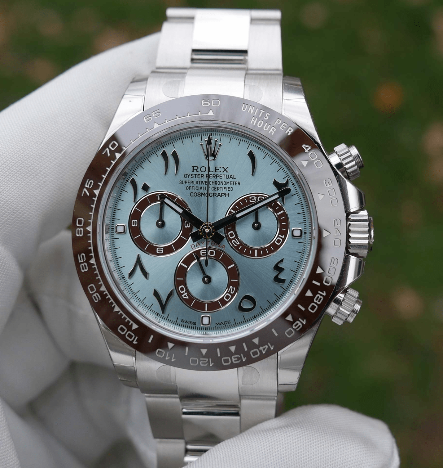 • Replica Rolex Daytona Ice Blue Arabic Dial Platinum Watch