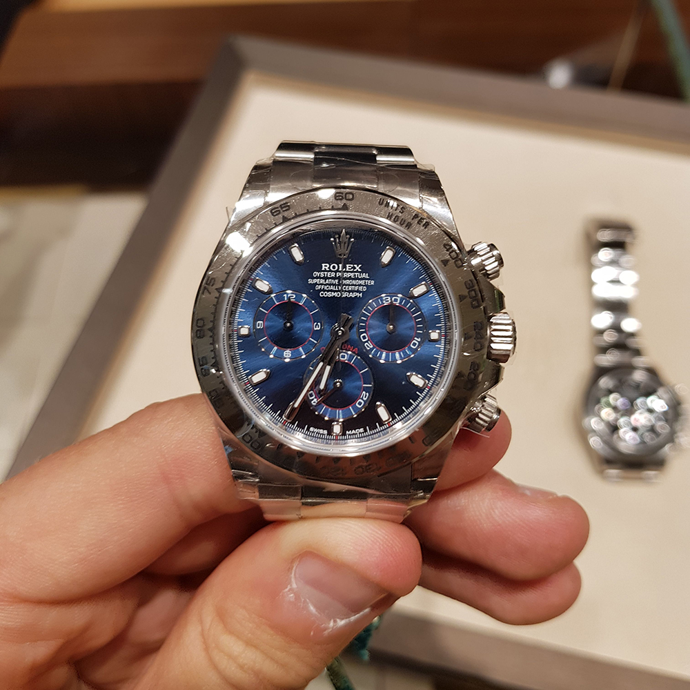 This Oyster Perpetual Cosmograph Daytona in 18 ct white gold, with a bright blue dial and an Oyster bracelet, features an 18 ct white gold bezel with engraved tachymetric scale.