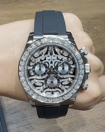 A Rolex Daytona with diamonds is not something new but one with a dial like the 116588TBR sure is! The black-lacquered dial has an applied 18k white-gold and diamond-set, wavy structure on the surface, which can remind you of a tiger's fur.