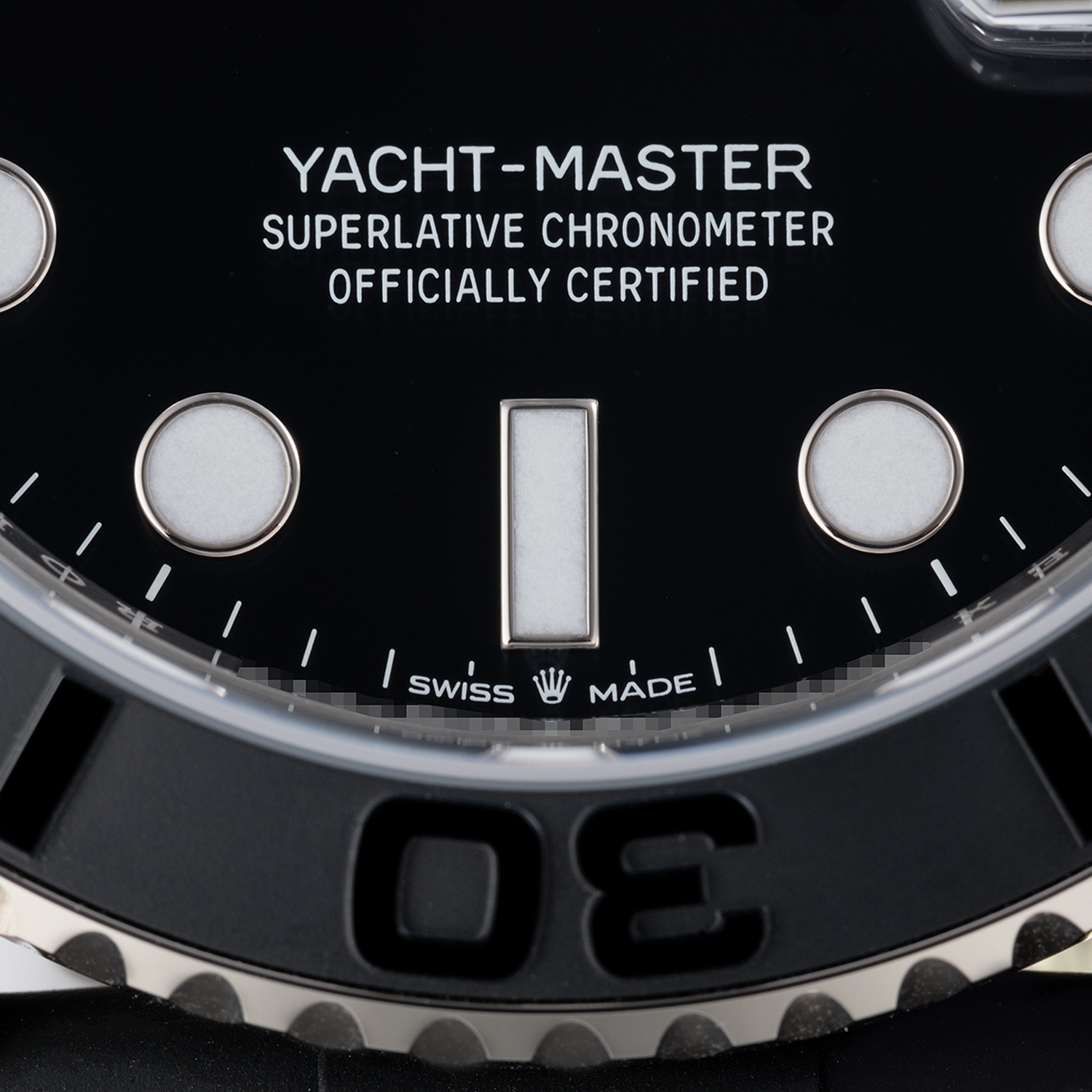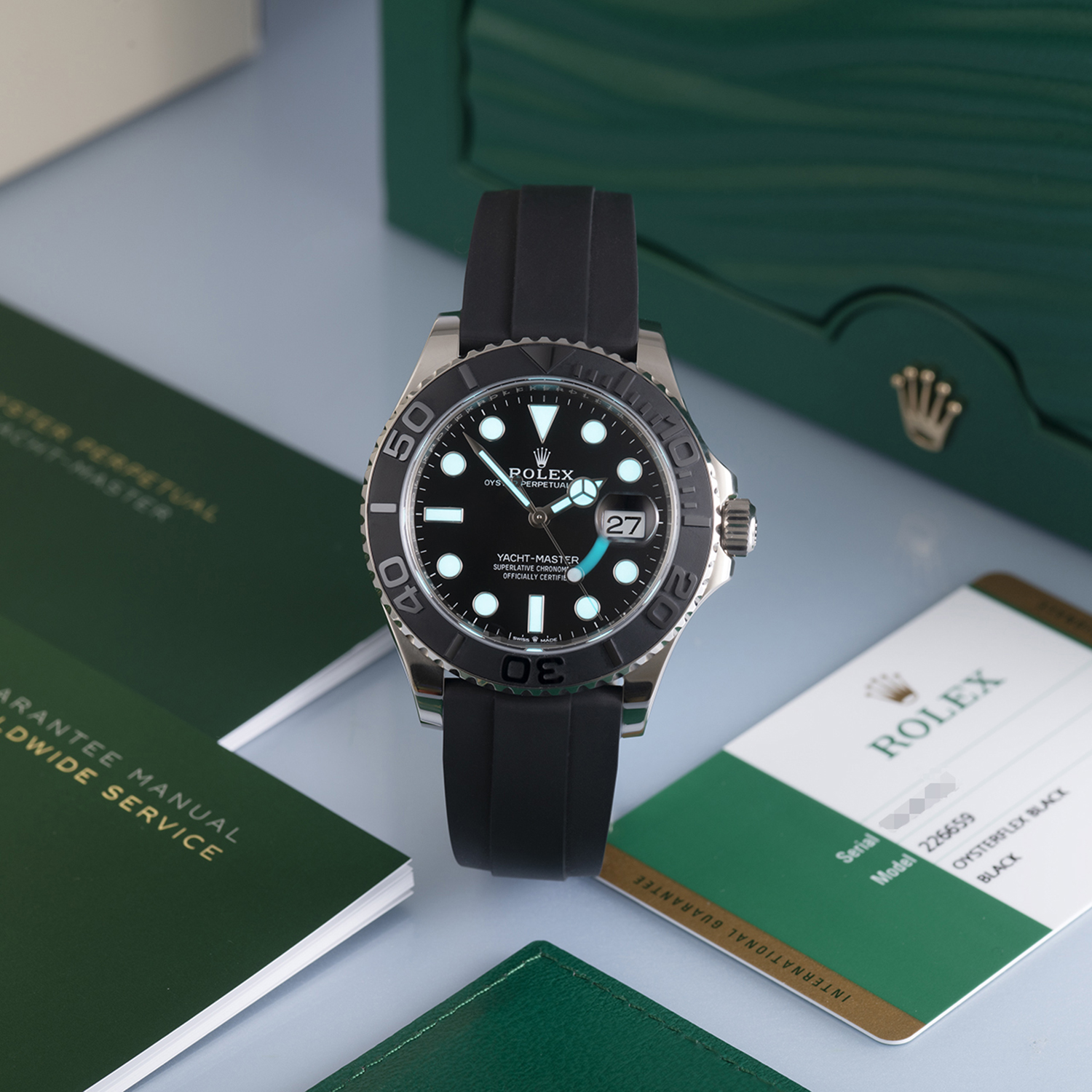 The most desirable Yacht-Master Rolex ever made. A fully fledged sports watch (waterproof to 100m), yet elegant and discreet enough for the boardroom, this precious metal Yacht-Master ref. 226659 is fitted to the super comfy black Oysterflex strap. Sporting a matt finished bi-directional Cerachrom bezel (developed by Rolex to be scratch & fade resistant ) and a highly legible black dial with Chromalight hands & markers. Powered by Rolex's updated self-winding calibre 3235, now with a generous 70-hour power–reserve. Waterproof to 100m.