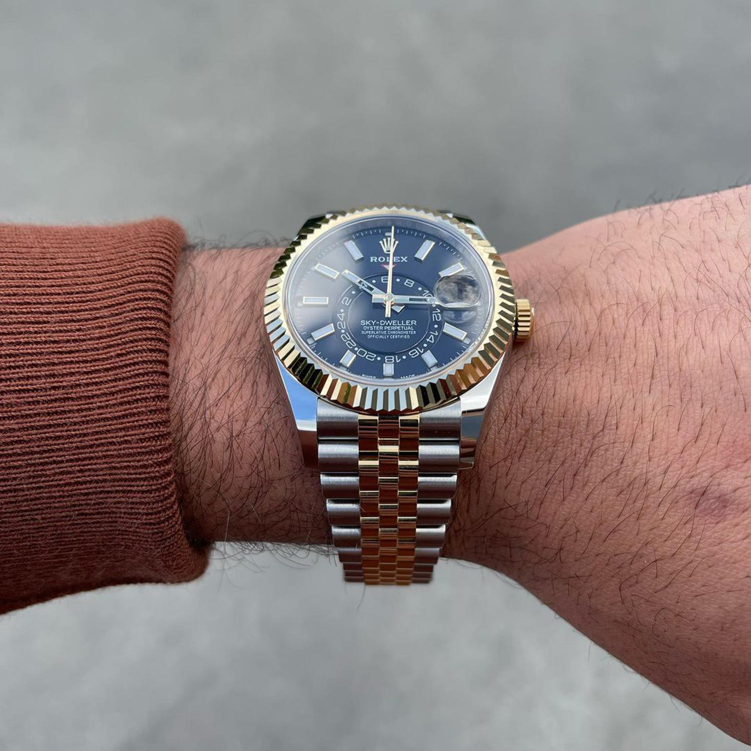 Rolex Sky-Dweller Men's Watch 326933-0005. This 42mm watch features a stainless steel case with an 18k yellow gold fluted Ring Command bezel and a two tone Jubilee bracelet. The black dial has an annual calendar feature and a GMT second time zone feature indicated by a rotating disc. It is powered by the Rolex Caliber 9001 self-winding automatic COSC Superlative Chronometer certified movement with a 72 hour power reserve.