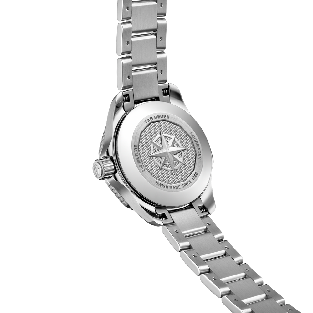 Featuring a delicate white mother-of-pearl dial, this 30 mm TAG Heuer Aquaracer strikes the right balance between elegance and technicity. With its ultra-resistant steel case, 60-minute scale bezel and bracelet, this timepiece is eager to go further. Water-resistant to 200 metres, the fine-brushed and polished steel case and screw-down crown adds robustness to this luxurious watch, fit for any achievement.