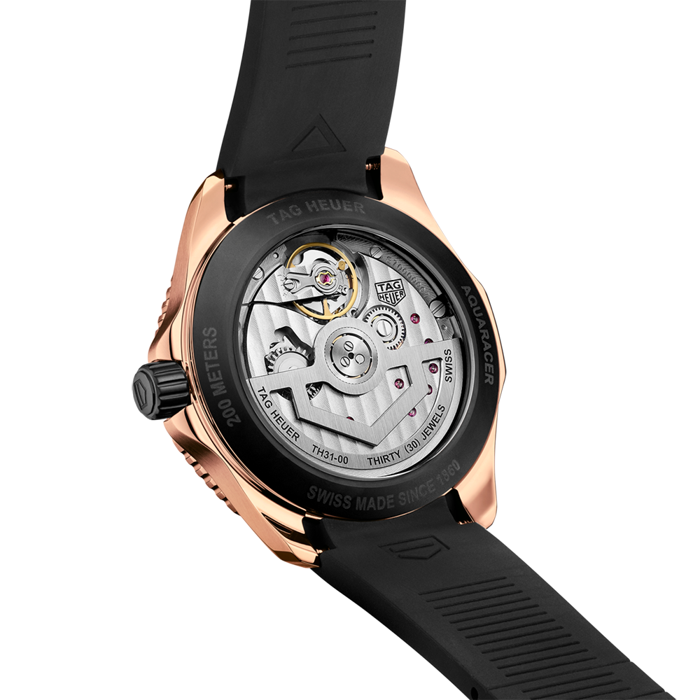 Combining noble materials such as 18K 5N solid rose gold and Grade 2 titanium with high-tensile rubber, this TAG Heuer Aquaracer perfectly pairs sheer elegance with extreme performance and versatility. Water-resistant to 200 metres and ready to raise the bar. The 18K 5N rose gold-plated hands and indexes, applied with white Super-LumiNova, stand out against the slightly fumé sunray brushed black dial. Inside the ultra-resistant 18K 5N rose-gold case with matching unidirectional bezel, the COSC-certified Chronometer TH31-00 movement offers an 80-hour power reserve.