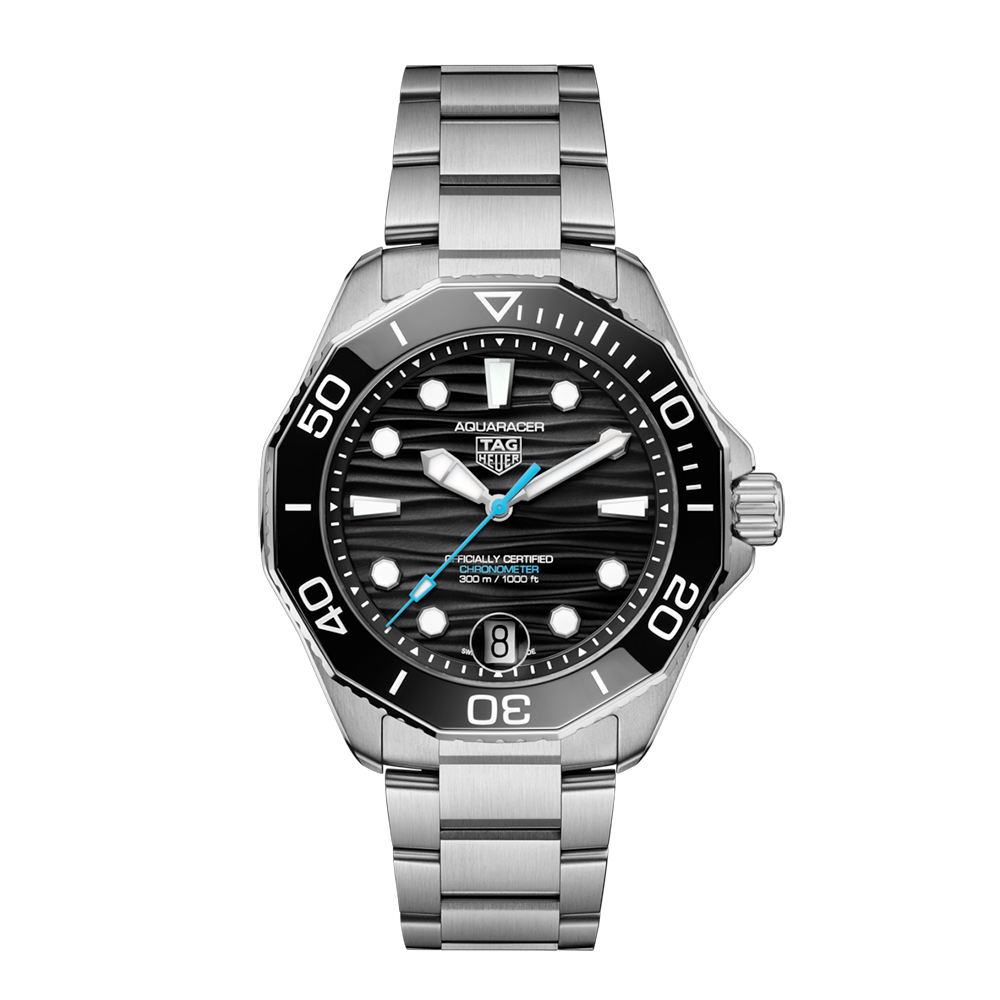 You’re all set to face the ocean's most enduring challenges with this TAG Heuer Aquaracer Professional 300. This 42 mm watch, driven by the COSC-certified Calibre TH31-00, is your steadfast ally for deep-sea endeavours. The black wavy pattern dial shows luminous white Super-LumiNova-filled indexes and hands, while a light blue central hand adds a splash of colour.