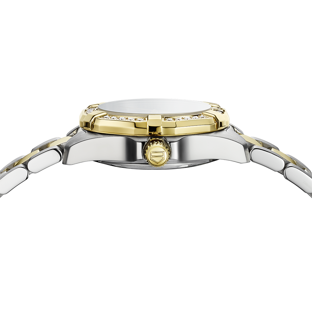 Sporty, elegant and feminine with all the Aquaracer's sporty features re-interpreted into an ultra-feminine design. This watch is presented in stainless steel and 18ct yellow gold, with a white mother of pearl dial brought to life with eleven glittering diamonds to mark the hours, and a date window at 3, completed with a diamond set bezel. Water resistant to 300m, this stunning watch is powered by a precision Swiss quartz movement.