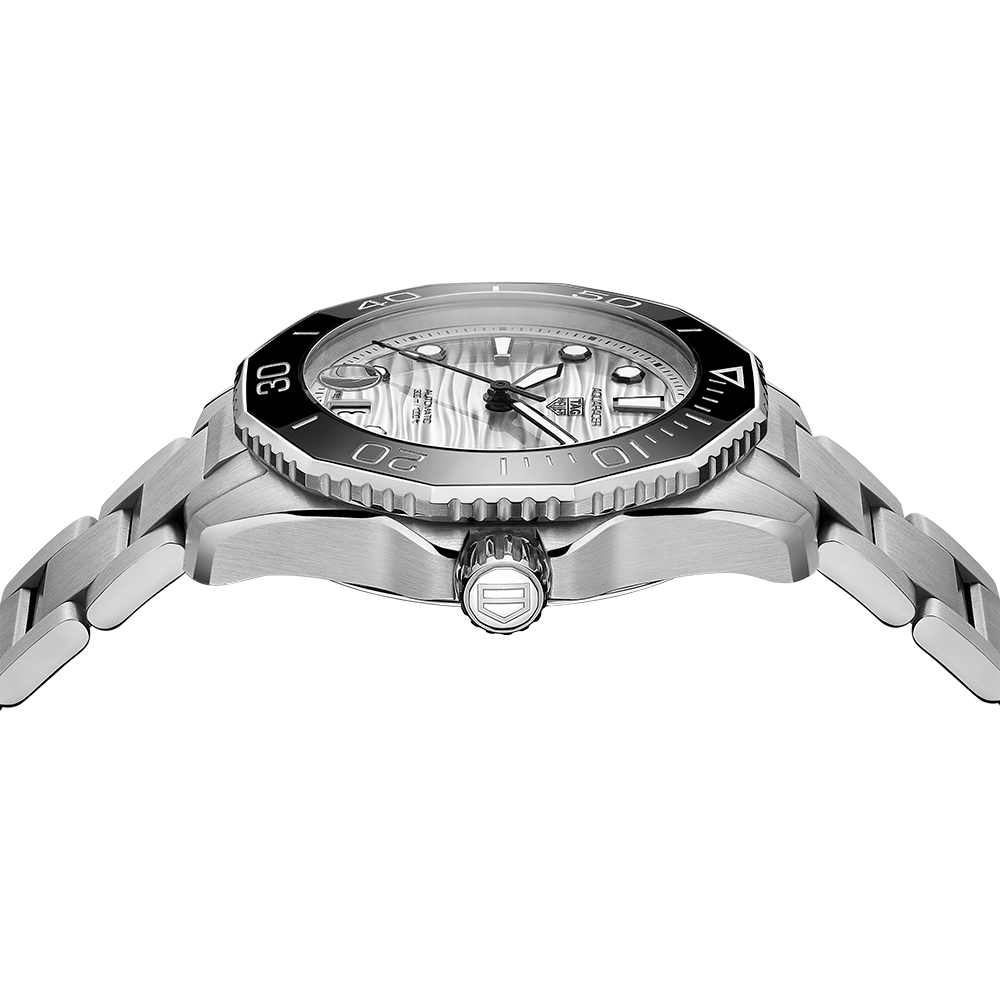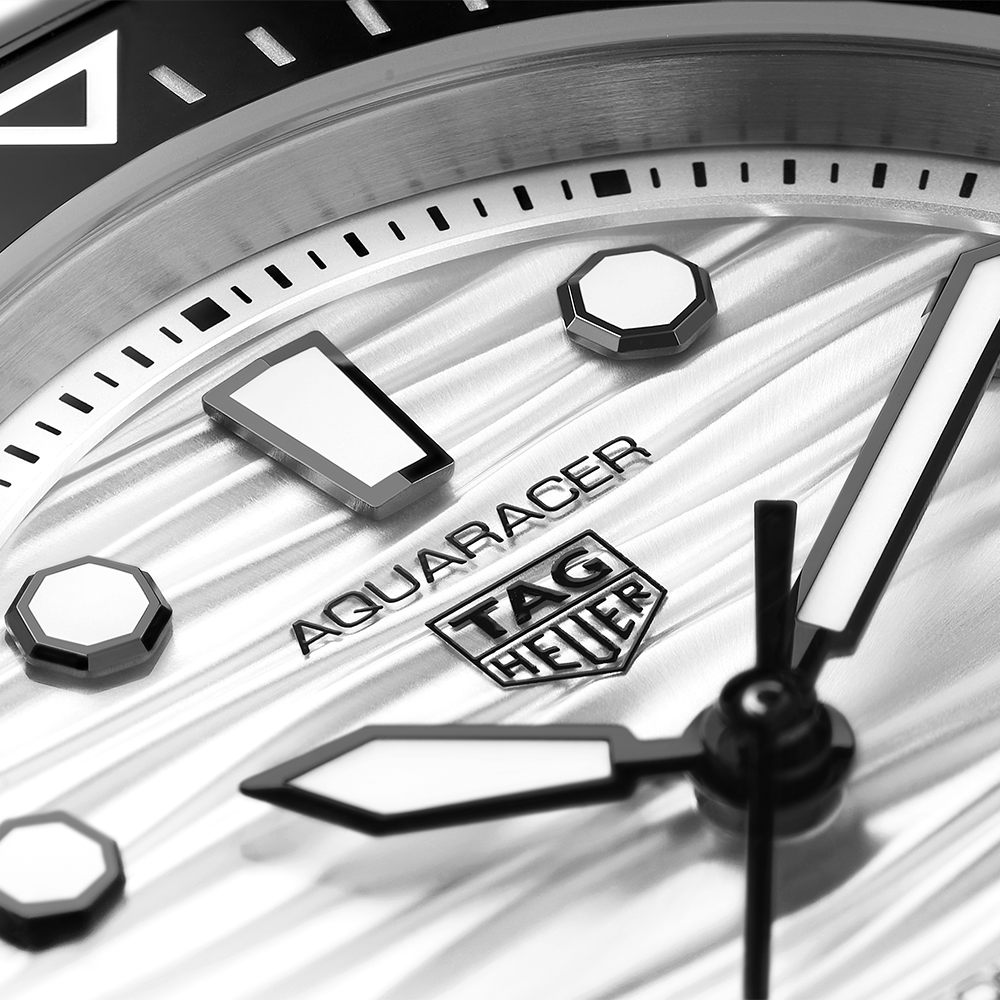 Meet the perfect diving companion in 36mm. This special edition TAG Heuer Aquaracer, with its silver-lacquered dial, is ready for any challenge. Bold black gold-plated hands and markers applied with white Super-LumiNova offer absolute legibility day and night. A steel screw-down crown preventing water entry, and a resistance to 300m deep brings robustness and reliability in the most extreme conditions. Robust yet stylish, the slim profile 36mm case combines brushed and polished steel, a perfect match to the scratch-resistant black ceramic bezel.