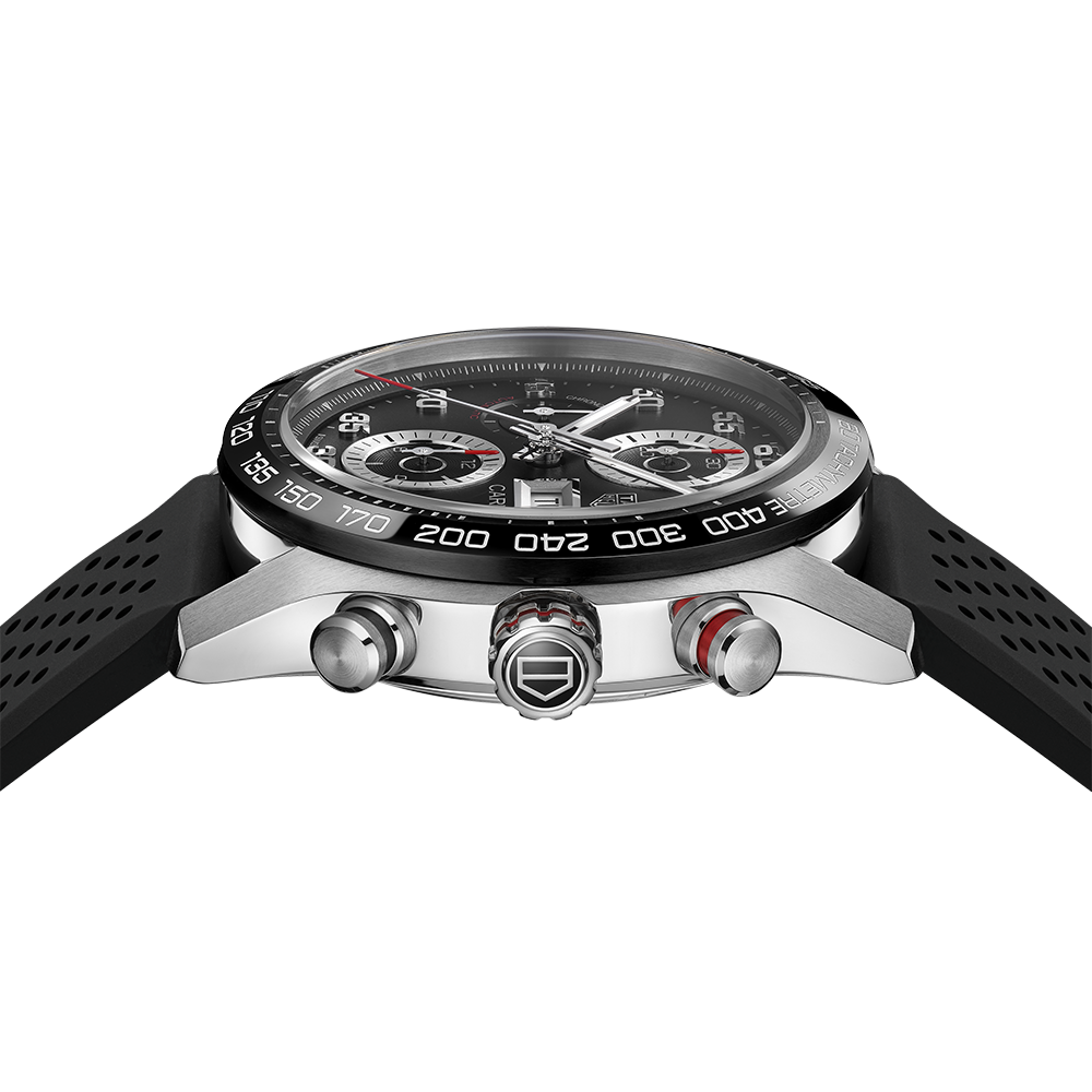 As daring as ever, the resilient TAG Heuer Carrera is driven to the next level thanks to new details on this proudly upgraded chronograph. Improved dial and case elements prove the boldness and conviction of this great classic. Standing out with a black dial, this TAG Heuer Carrera features dramatically enhanced sporty red touches, as well as numerals and text in a striking new font. With a distinctive 44mm steel case, black ceramic bezel and powered by the Calibre 16 automatic, this TAG Heuer Carrera reveals all its strength of character.