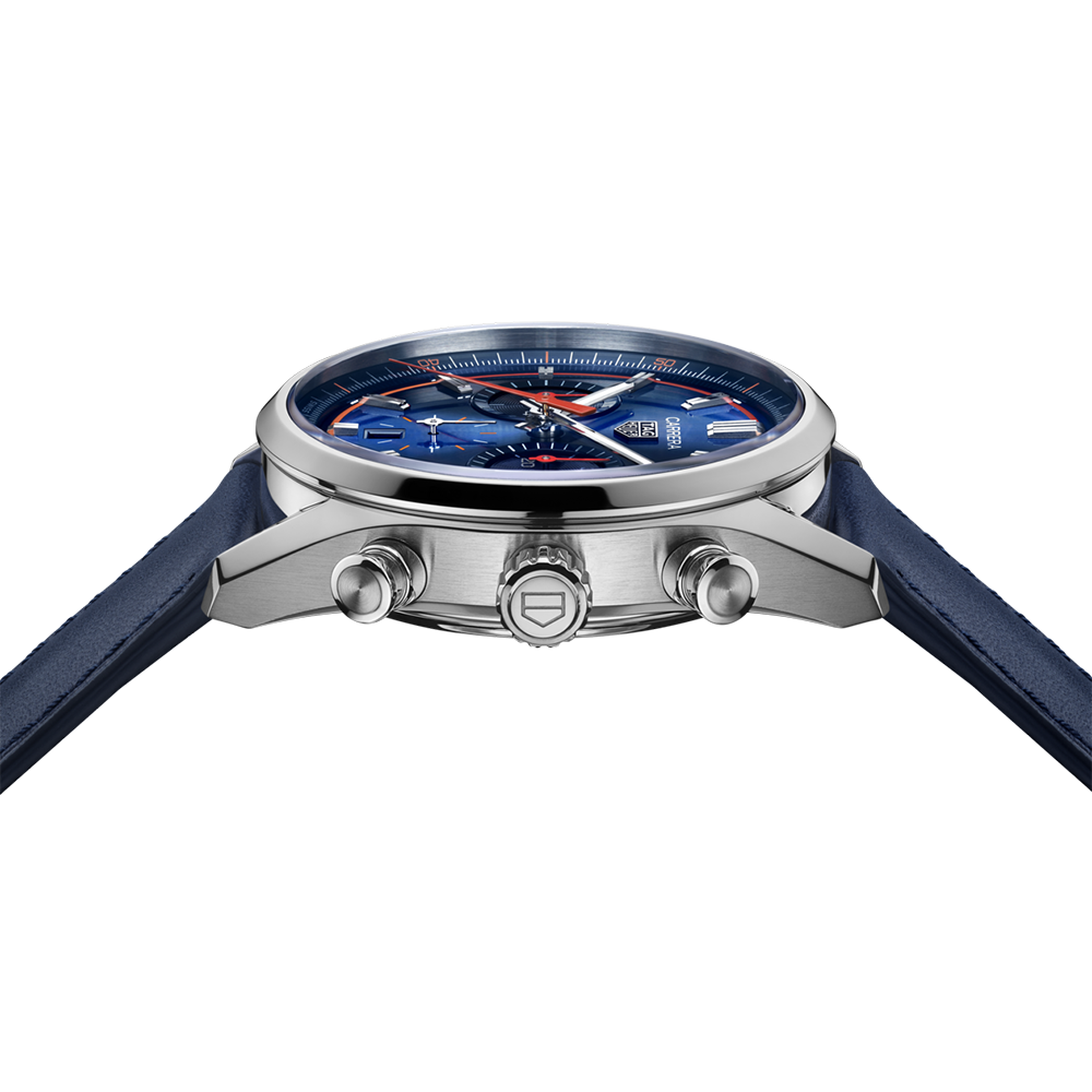 This modern and dynamic take on the TAG Heuer Carrera brings the spirit of motor racing to the fore. Featuring a striking orange gradient ring and vivid orange touches, the intense blue dial matches the blue calfskin strap superbly. Victory lies ahead. Proudly showcasing its timeless design, the signature blue Carrera dial shows a speedometer-like orange gradient circle running along the flange. Water-resistant to 100 metres, the 42mm fine-brushed steel case protects the thrilling in-house Calibre Heuer 02. Ready to overcome.