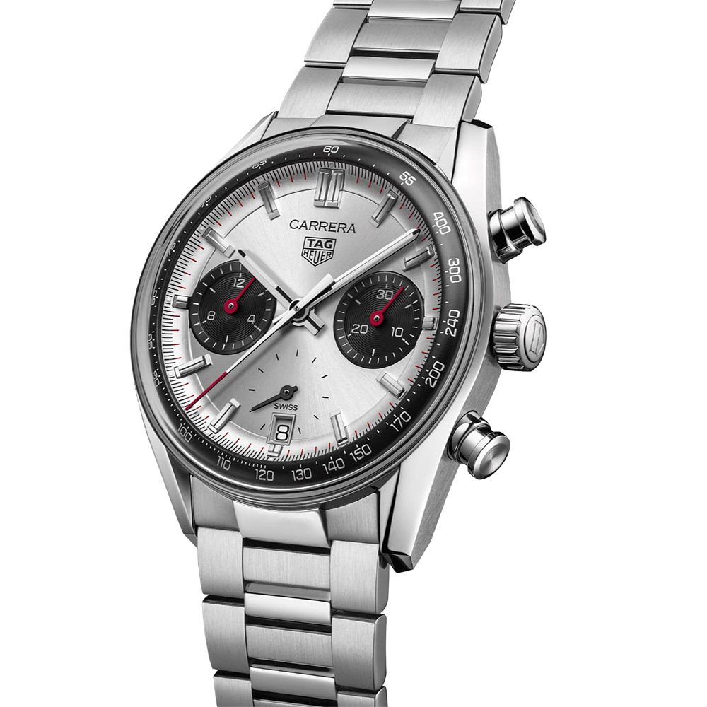 Embrace the rebirth of a legend with the TAG Heuer Carrera Chronograph in 39 mm. Paying tribute to the iconic ‘Panda' look of the sought-after Heuer 7753 SN, this distinctive timepiece blends classic allure with a bold glassbox design for a new era of racing and heritage enthusiasts. The emblematic bi-compax ‘Panda’ layout - pairing a silver sunray brushed dial with twin black 'azuré' subdials - offers optimal legibility thanks to the curved flange, and the contrasted elements of the dial.