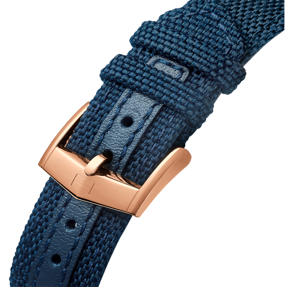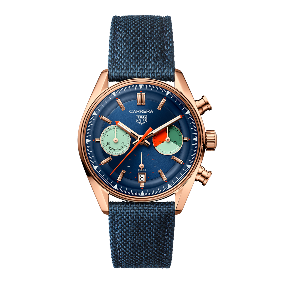 Embark on a luxury odyssey with the TAG Heuer Carrera Chronograph Skipper, a 39 mm masterpiece celebrating the Maison's storied sailing legacy. Crafted with 18K 5N solid rose gold, this timepiece is a modern treasure for collectors and sailing enthusiasts alike. A nod to the open sea, the blue circular-brushed dial blends touches of green, orange, and the unique “intrepid” teal colour on the regatta countdown indicator.