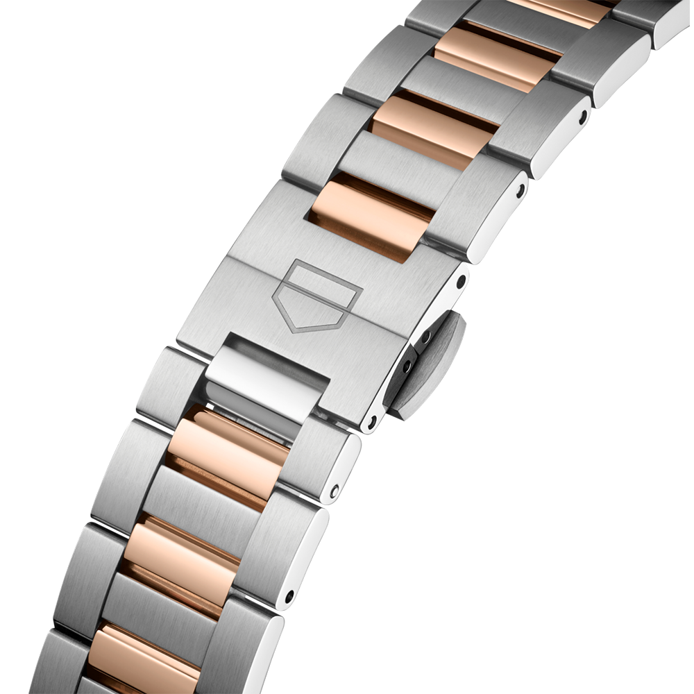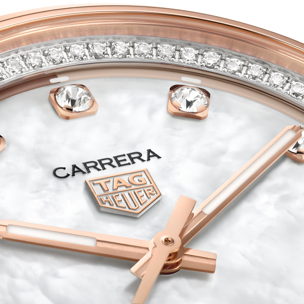 Delve into refined elegance with this 36 mm TAG Heuer Carrera Date, where the iridescence of mother-of-pearl echoes the timeless luxury of 18ct 5N solid rose gold—a tribute to the original Carrera's legacy, reimagined with classic sophistication. The white mother-of-pearl dial, adorned with a gradient track and a radiant flange set with 76 diamonds (0.288 cts), shows 18ct 5N rose gold plated indexes set with 11 VS+ diamonds (0.22 cts). Encircled by an 18ct 5N solid rose gold bezel, the fine brushed-polished steel case matches the ergonomic, signature H-shaped bracelet for a seamless blend of strength and beauty. Beneath the surface, the Calibre 7 Automatic movement offers 56 hours of power reserve, making every moment count with unwavering precision.