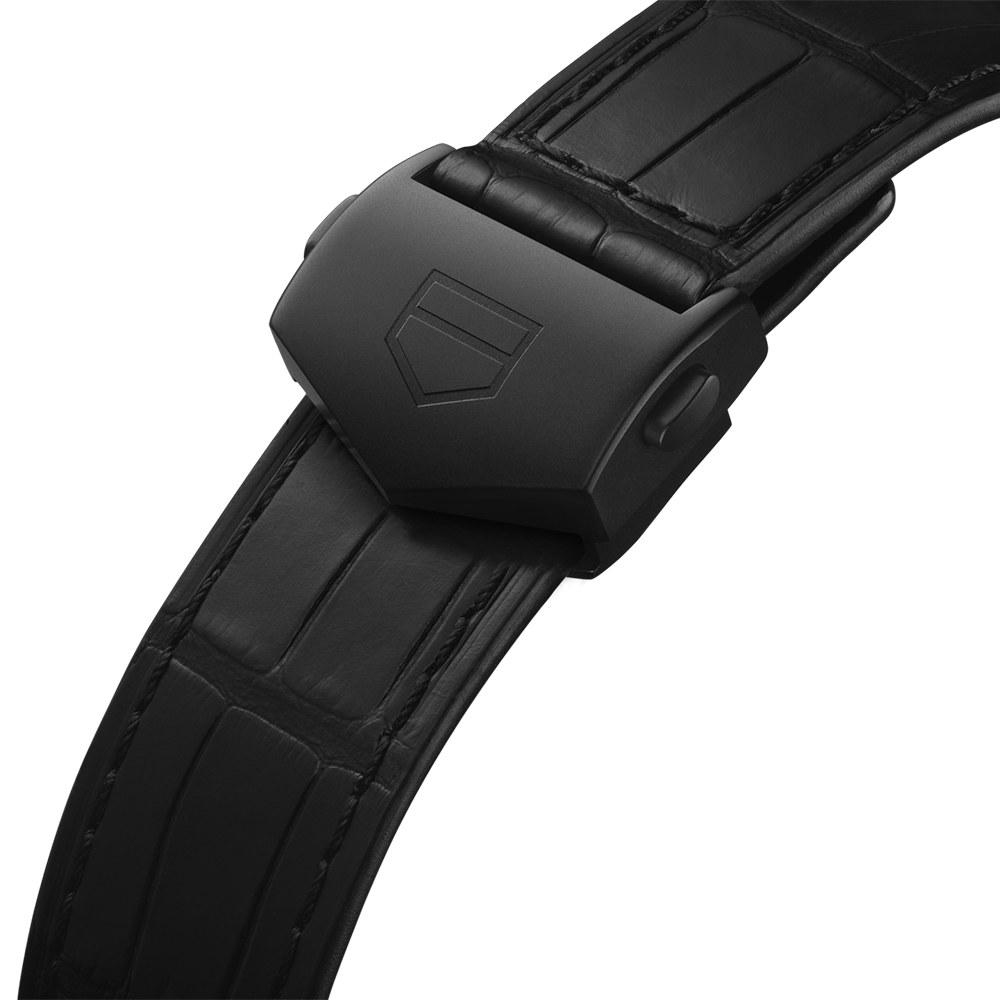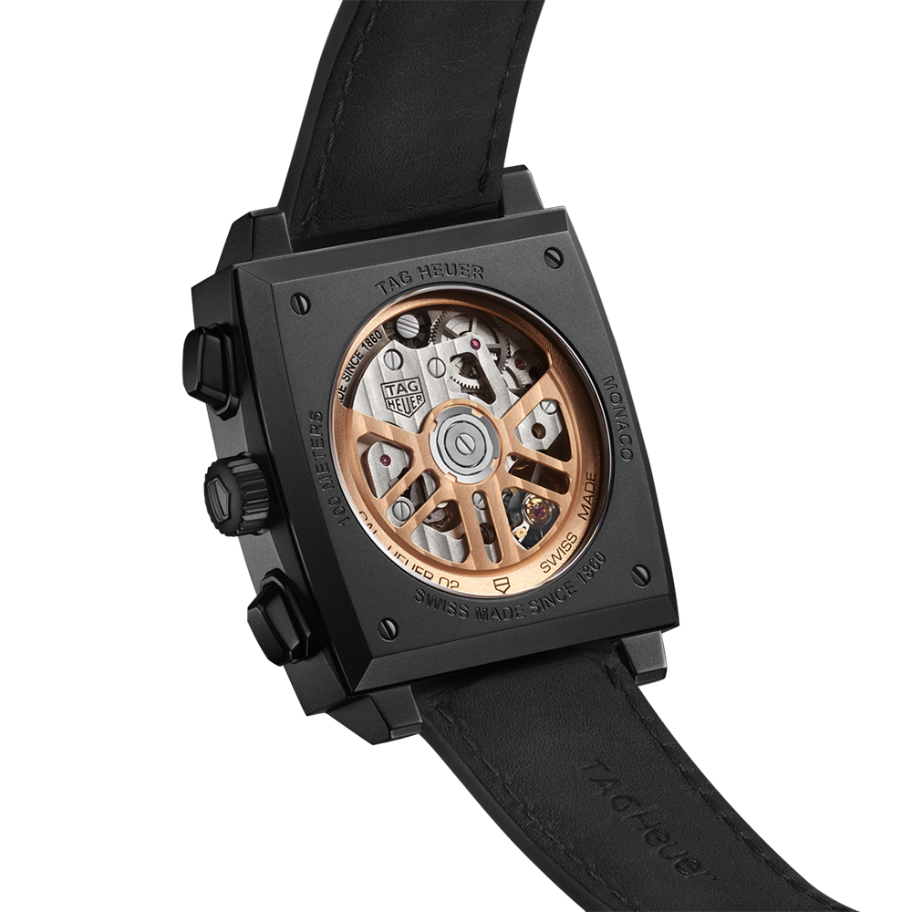 Paying homage to the rare and mythical all-black Monaco of the 70s, this TAG Heuer Monaco Special Edition is a must-have for connoisseurs. A fiercely elegant 39mm black DLC titanium case, houses the indomitable manufacture Calibre Heuer 02. Defiant and rebellious, the black circular brushed dial is contrasted by 18K 5N rose gold plated hands and indexes, filled with bold white Super-Luminova. A clear caseback reveals the automatic movement, with daring 18K 5N rose gold plated on the oscillating weight to match the dial. An iconic illustration of masterful technicity.