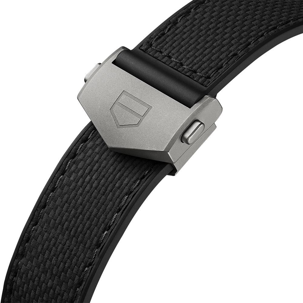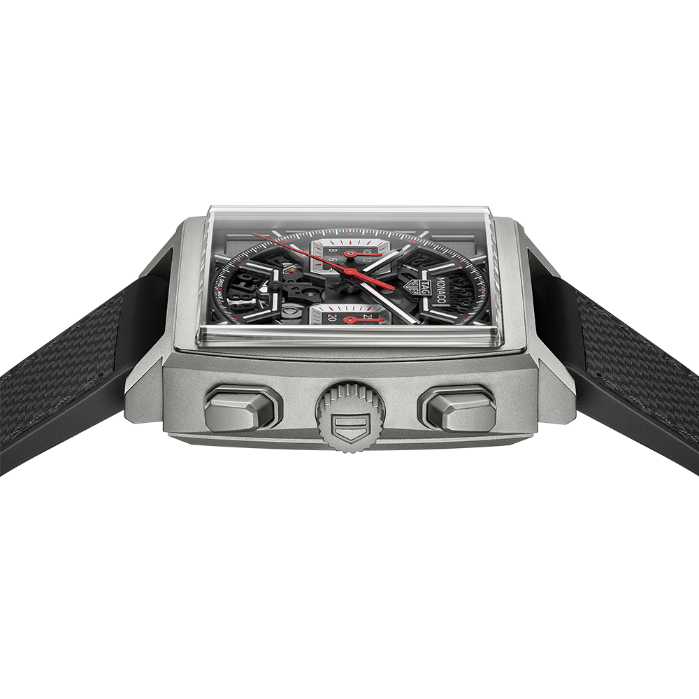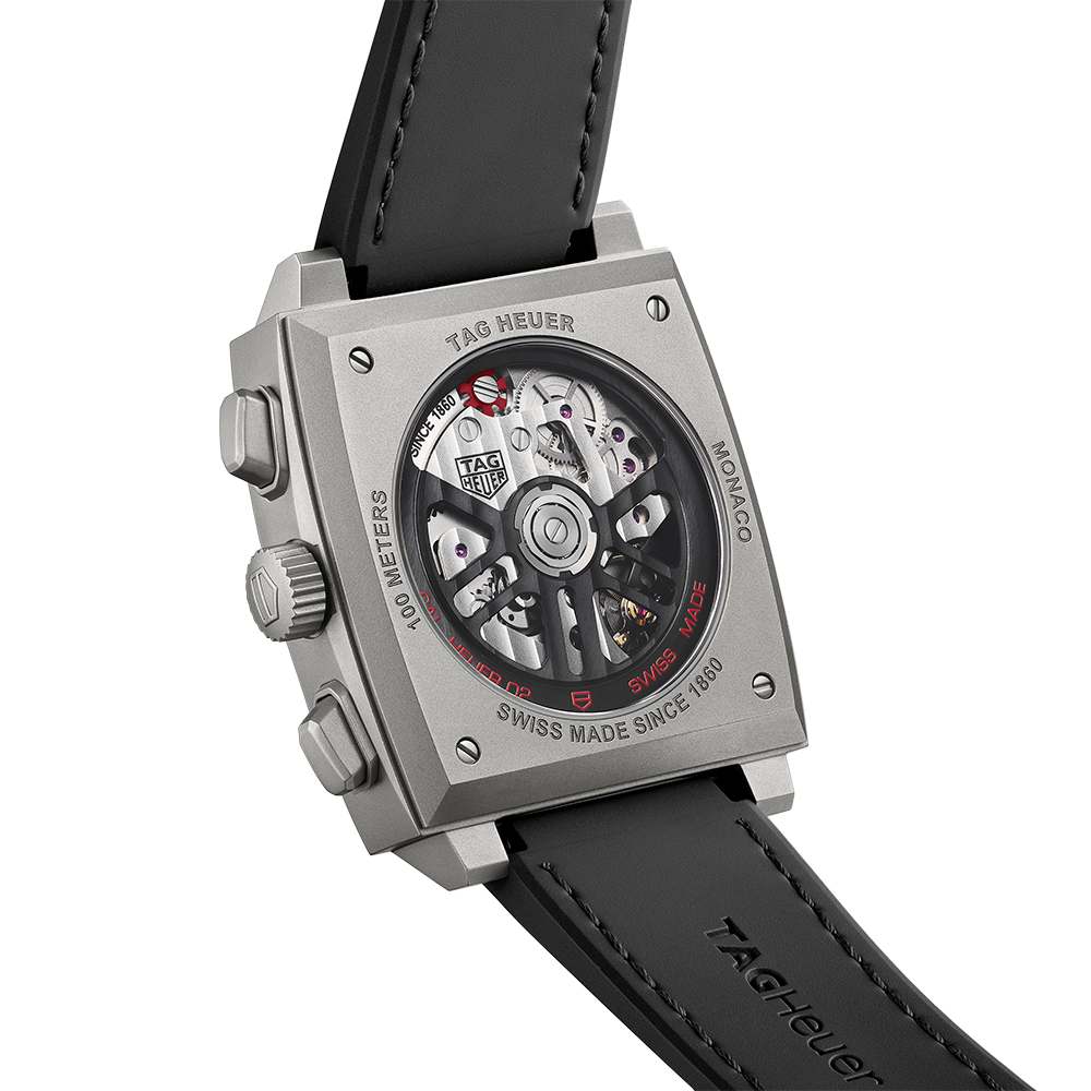 Instantly recognisable by its iconic square-shaped design, this TAG Heuer Monaco pays a bold tribute to its racing DNA. The skeletonised dial, combined for the first time with the in-house Heuer 02 movement, proudly distills its strength of character. Set against the sandblasted black skeletonised dial, the bright red and white highlights add a defiant edge to this racing-inspired timepiece. The ultra-lightweight and technical 39mm titanium grade 2 case integrates the reliable Calibre Heuer 02 Automatic. A maverick’s best ally. As luxurious as it is resistant, the embossed black strap strikes the perfect blend between the elegance of leather and the robustness of rubber.